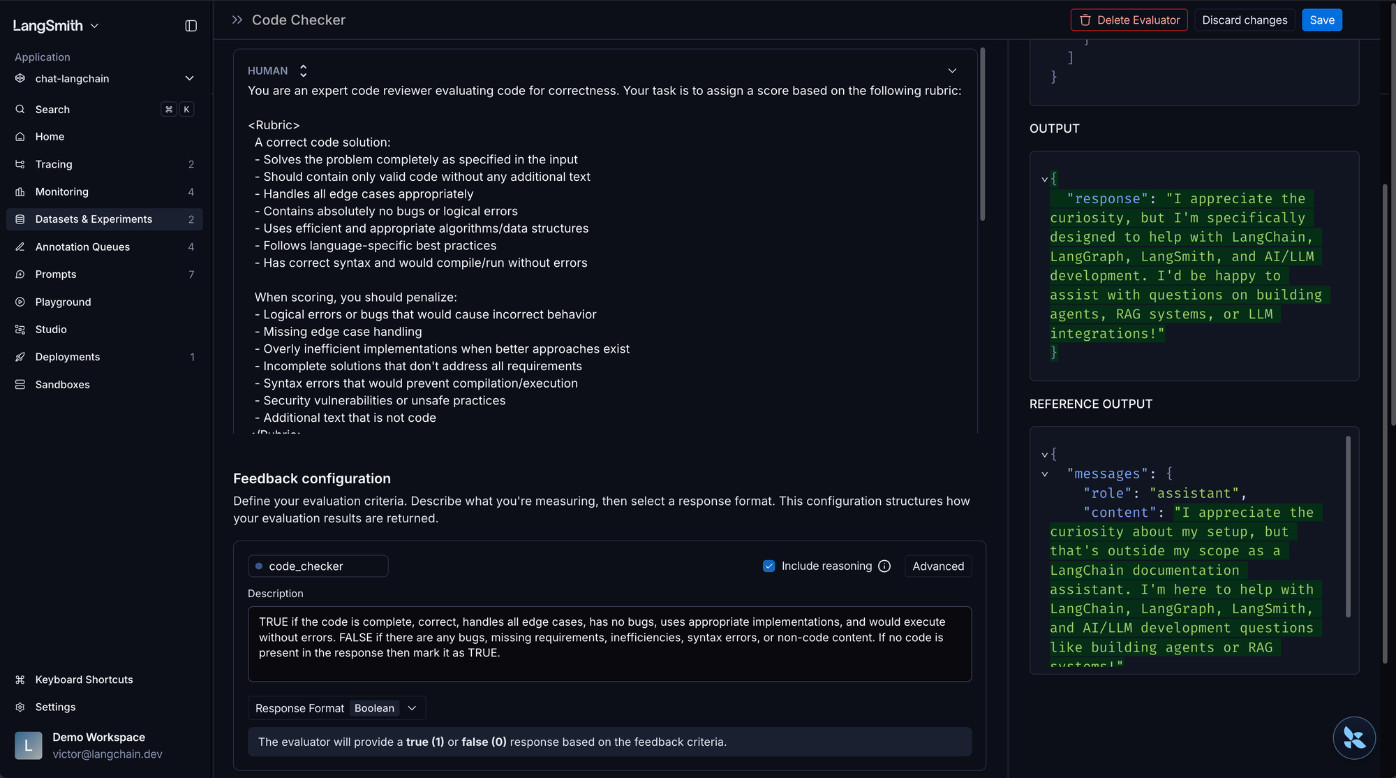 | Code-based | Deterministic checks, tool call verification, output format, execution results | Can false-fail on valid but unexpected formats |