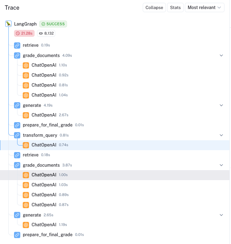 Here is an example trace that highlights the ability of active RAG to self-correct. The question is Explain how the different types of agent memory work?. All four documents were deemed relevant, the generation versus documents check passes, but the generation was not deemed fully useful to the question.