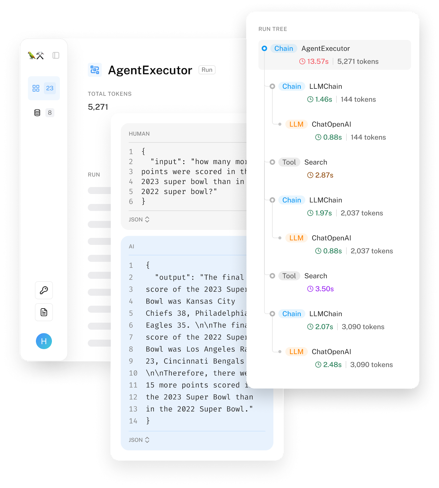LangSmith gives you full visibility into model inputs and output of every step in the chain of events. This makes it easy for teams to experiment with new chains and prompt templates, and spot the source of unexpected results, errors, or latency issues. We’ll also expose latency and token usage so that you can identify which calls are causing issues.