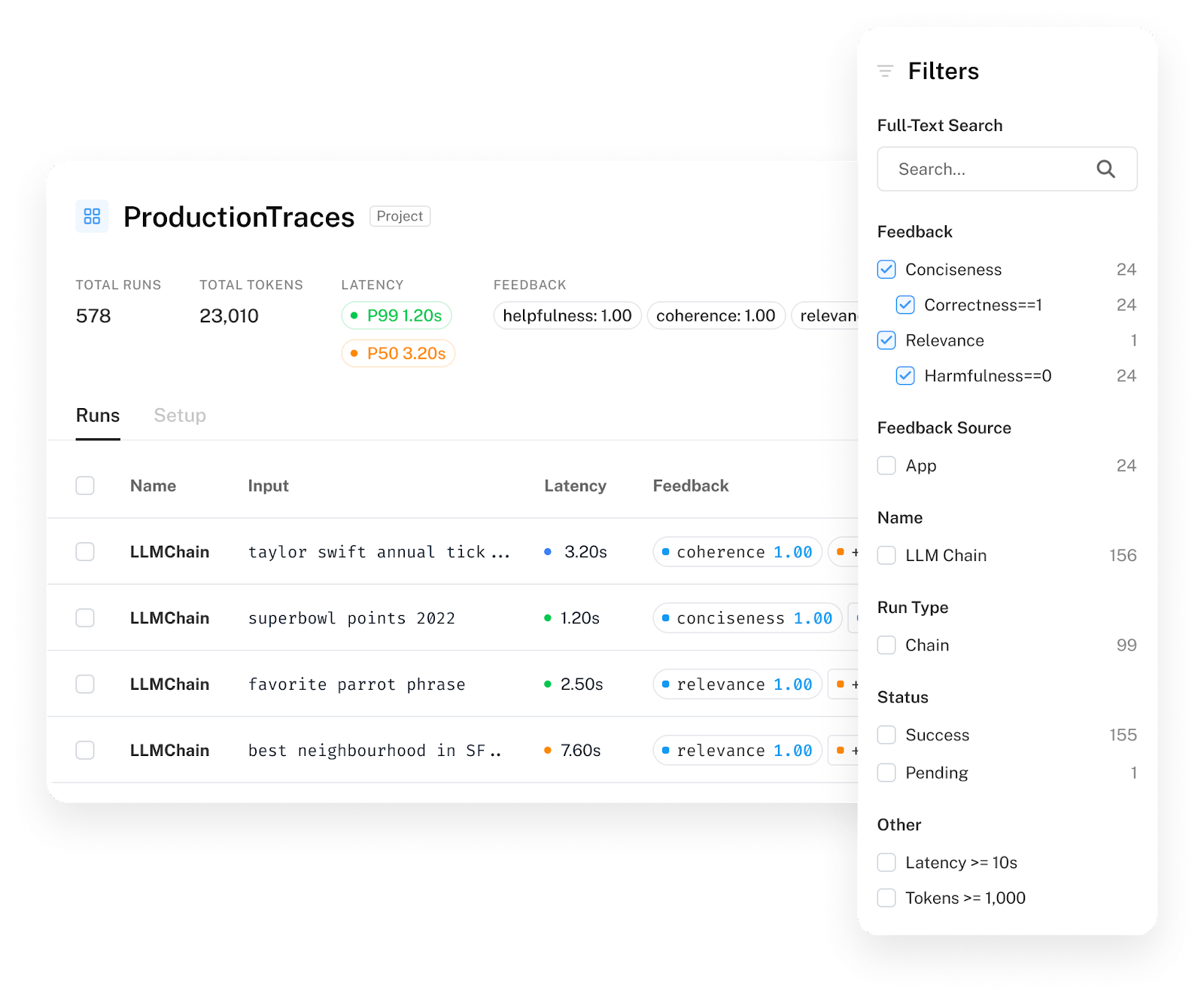 While debugging, testing, and evaluating can help you get from prototype to production, the work doesn’t stop once you ship. Developers need to actively track performance, and ideally, optimize that performance based on feedback. We consistently see developers relying on LangSmith to track the system-level performance of their application (like latency and cost), track the model/chain performance (through associating feedback with runs), debug issues (diving into a particular run that went wrong), and establish a broad understanding of how users are interacting with their application and what their experience is like.