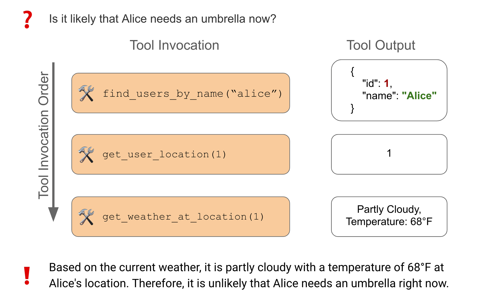 The agent first retrieves Alice's user ID, then uses that user ID to fetch the current location, and finally it uses the location ID to fetch the current weather. Since the current weather in Alice's location is partly cloudy, it is unlikely that she will need an umbrella. If the agent skips any of these steps, it will lack the required information to accurately provide the final answer.