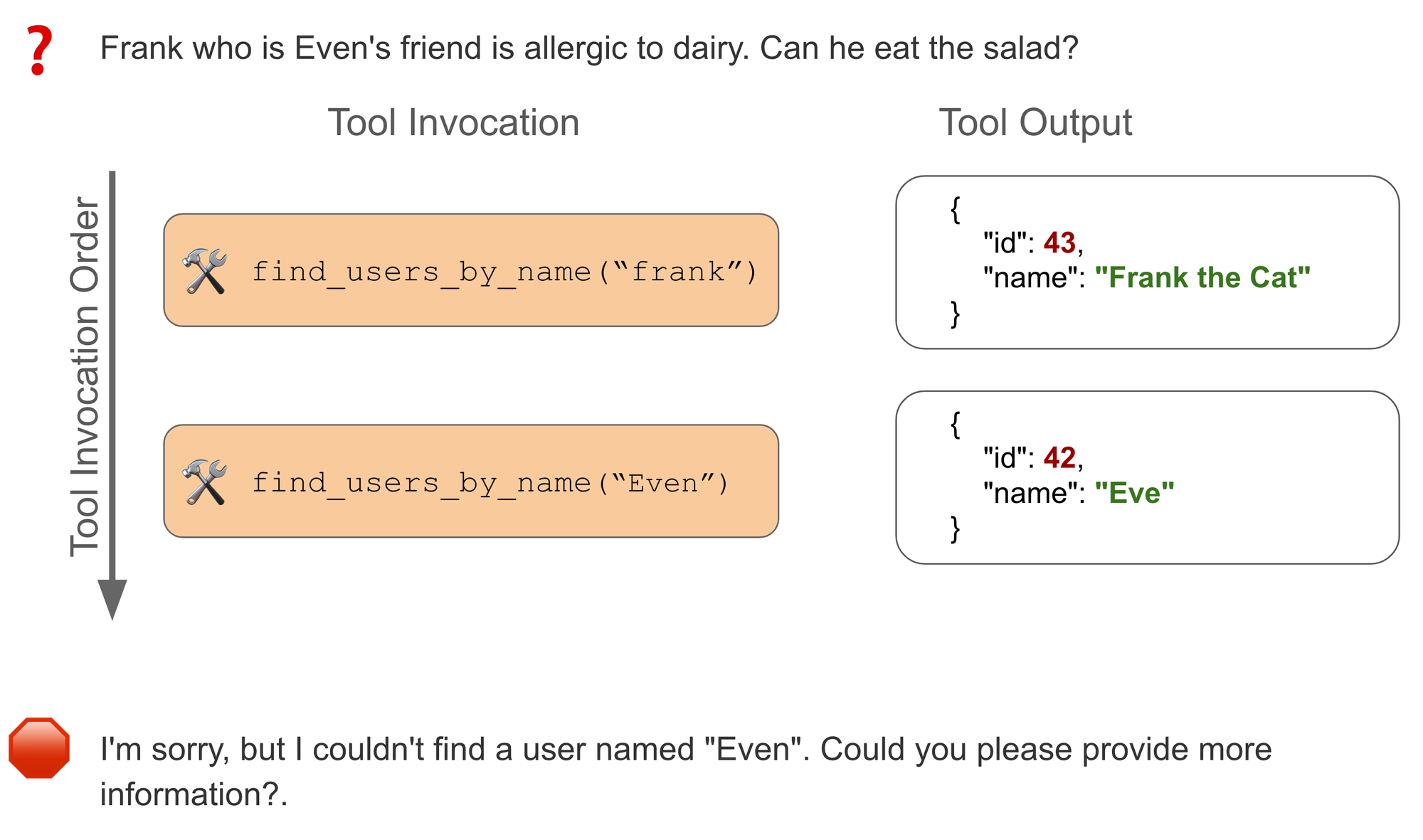 In this case, GPT-4 makes the correct first call to get_users_by_name("Frank"). The tool returns with information about "Frank the Cat." The model then decides this doesn't match the requested "frank", so it queries again for "Even". There is no direct match, so the agent gives up, responding that it cannot find a user named "Even". While it may be understandable that it would be less confident about "Frank the cat", the agent neither considers it as a possible match nor does the agent mention it in its ultimate response to the user, meaning the user wouldn't be able to effectively provide feedback to help the agent self-correct.