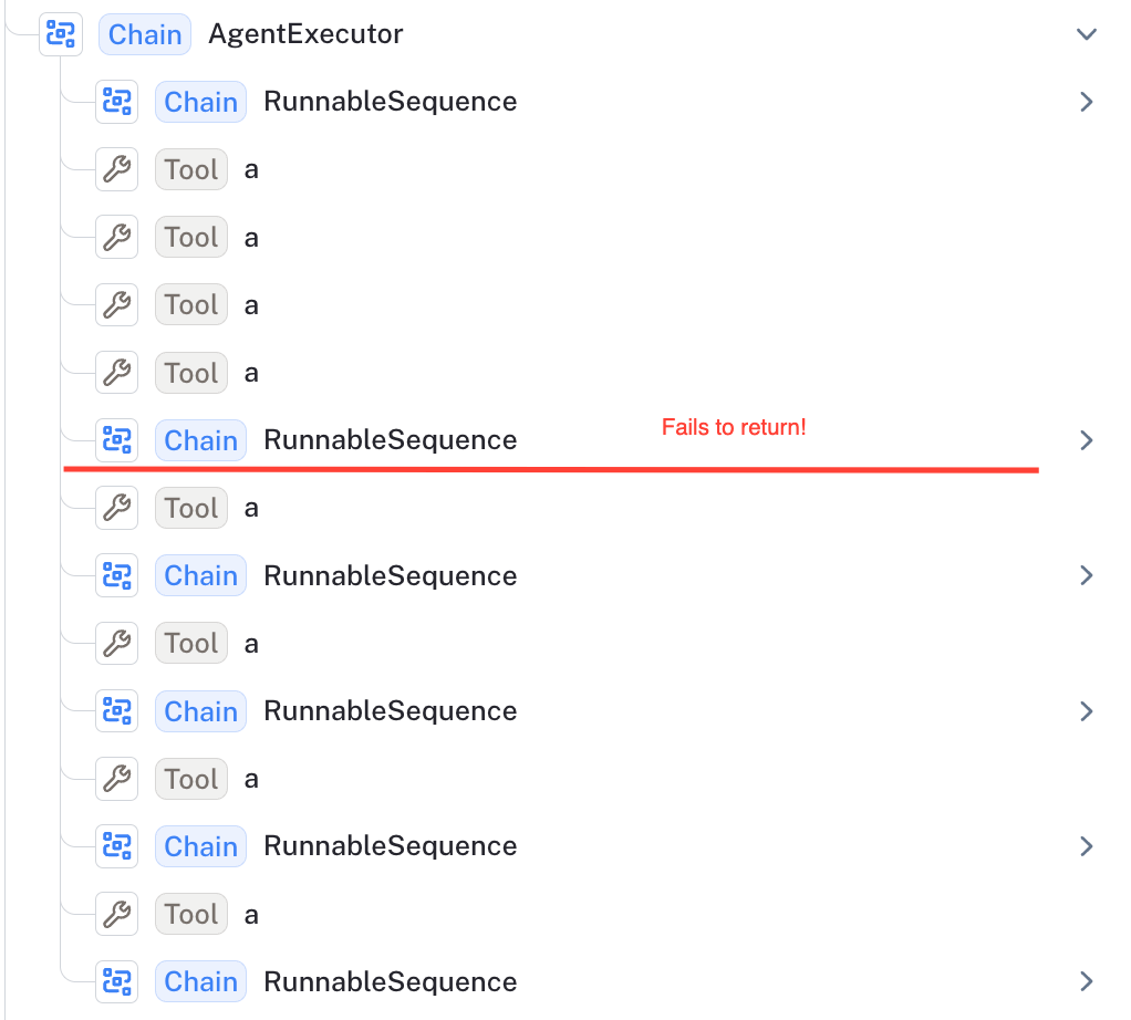 We were surprised by the poor performance of the fine-tuned mistral-7b-instruct-v0.1 model. Why does it struggle for this task? Let's review one of its runs to see where it could be improved. For the data point "aaa" (see linked run), the model first invokes "a", then responds in text "a" with a mis-formatted function call for the letter "b". The agent then returns.