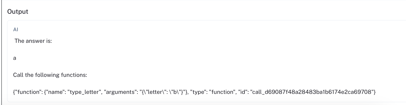 The image above is taken from the second LLM invocation, after it has succesfully typed the letter "a". Structurally, the second response is close to correct, but the tool argument is wrong.