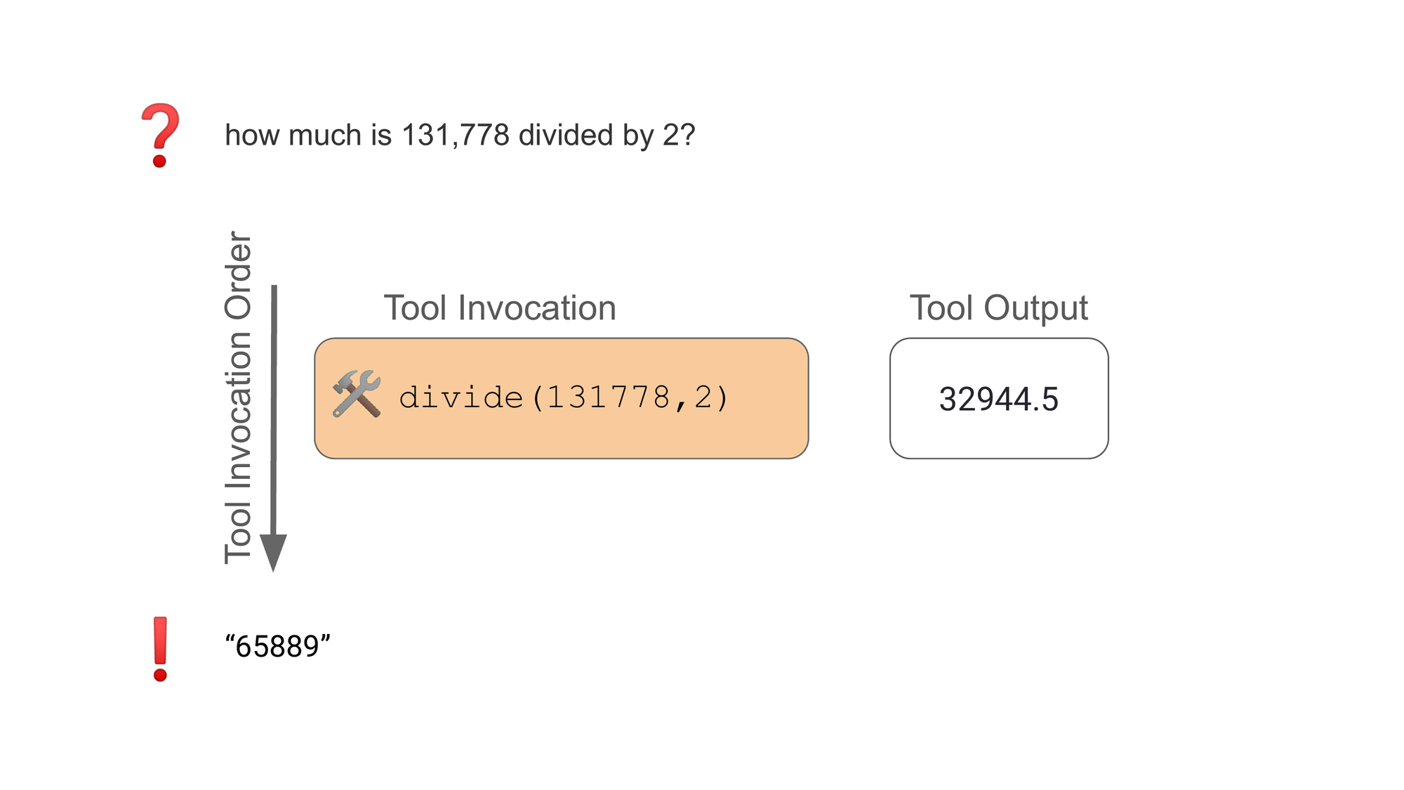 While the GPT-4 agent correctly calls the divide() tool, it ignores the output from the tool and instead uses what it thinks the answer should be. This happens despite the instructions to the agent stating that it should only rely on tool outputs for its answers.