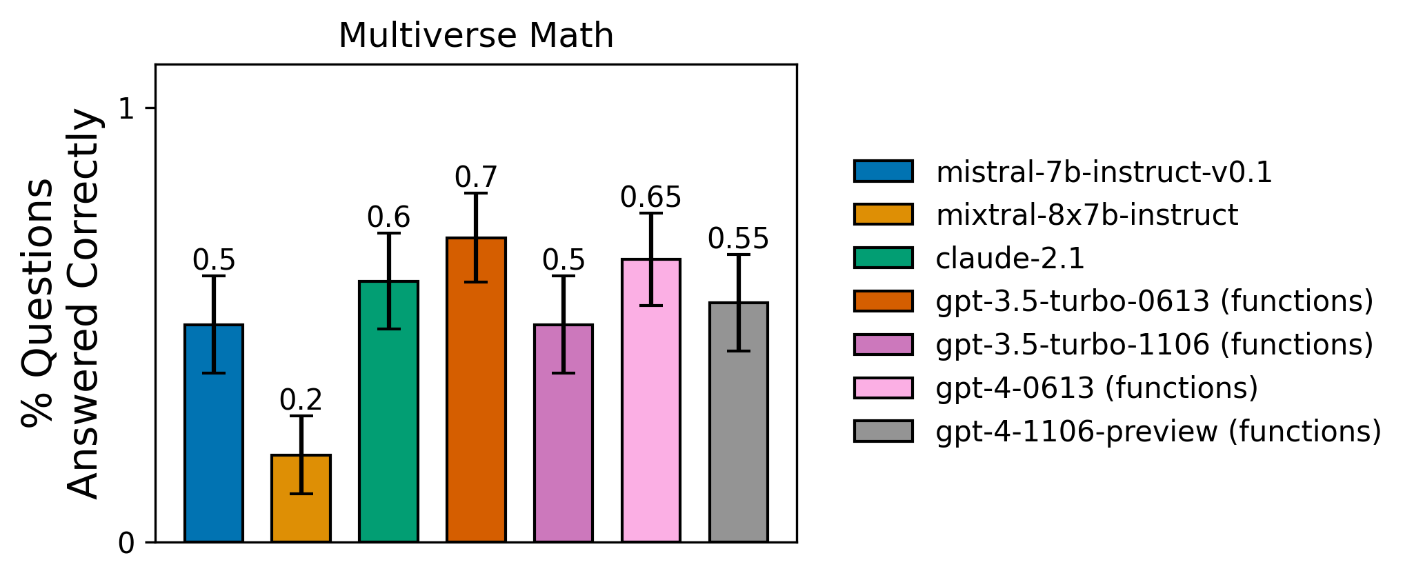 mistral-7b model) on this task. Scale does not always translate to quality improvements if the task is out of distribution.The multiverse math dataset tests two important characteristics of an LLM in isolation, without letting its factual knowledge interfere: