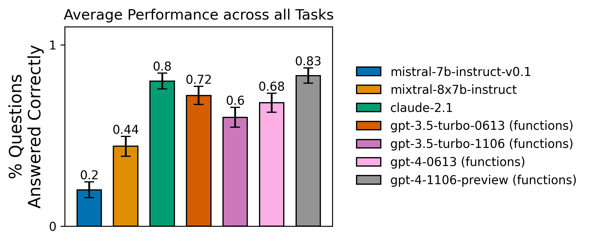 mistral-7b model failed to effectively call more than 1 tool in sequence.The chart above shows the average correctness for each agent over the given dataset. The error bars are the standard error: