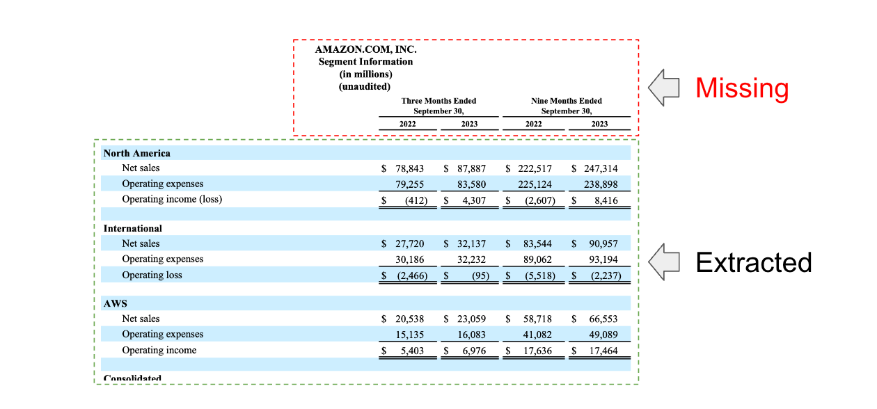 Directly extracting tables from documents is appealing: it would allow us to use methods like the multi-vector retriever to index each one. A few approaches to detect tables in documents are available and packages such as Unstructured or Docugami. We'll be following up with some specific analyses focused on these packages. However, it is worth flagging that table extraction is challenging due to variable representation of tables. For example, in our evaluation we saw cases where the table header was not correctly extracted using some of these methods (below). While challenging, these methods probably high the highest performance ceiling, especially for complex table types, and are worth examining carefully.