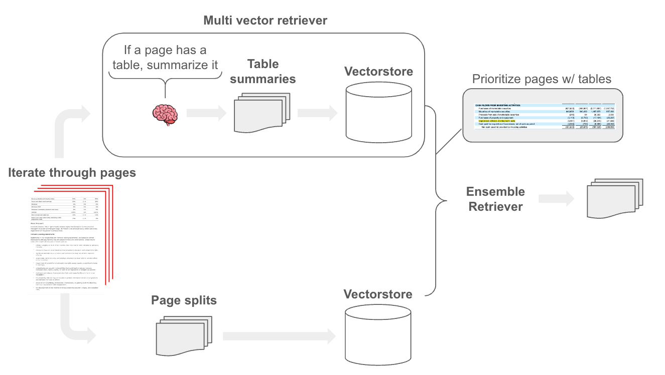 To combat this, we found a simple approach worked well: build a retriever that focuses on tables. To do this, we use an LLM to scan each page and summarize any tables within the page. We then index those summaries for retrieval and store the raw page text containing the table with multi-vector retriever. Finally, we ensemble retrieved table chunks with the raw text chunks. The nice thing about ensemble retriever is that we can prioritize certain sources, which allows use to ensure that any relevant tables chunks are passed to the LLM.