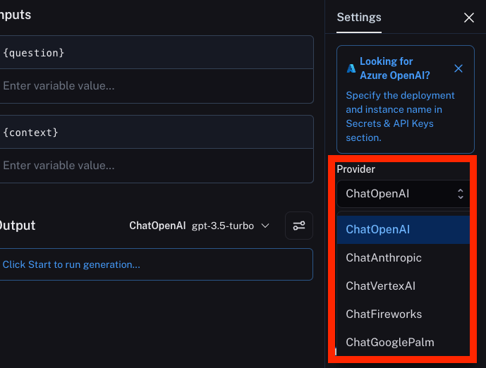The playground defaults to OpenAI, but we can click on the model provider to change it up.