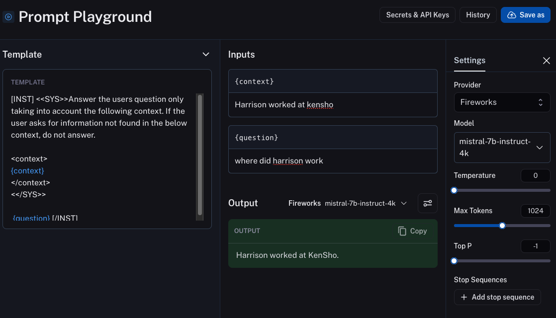 Concretely, we have integrated Fireworks AI into the playground, joining the ranks of OpenAI, Anthropic and Vertex AI as supported model providers. Read more about Fireworks AI below, but at a high level they provide API access to a plethora of OSS models. While other model providers in the playground require an API key to use, we've worked with Fireworks AI to enable anyone to use this integration regardless of whether they have an API key or not (note: you need to be signed into the LangSmith platform in order for this to work).