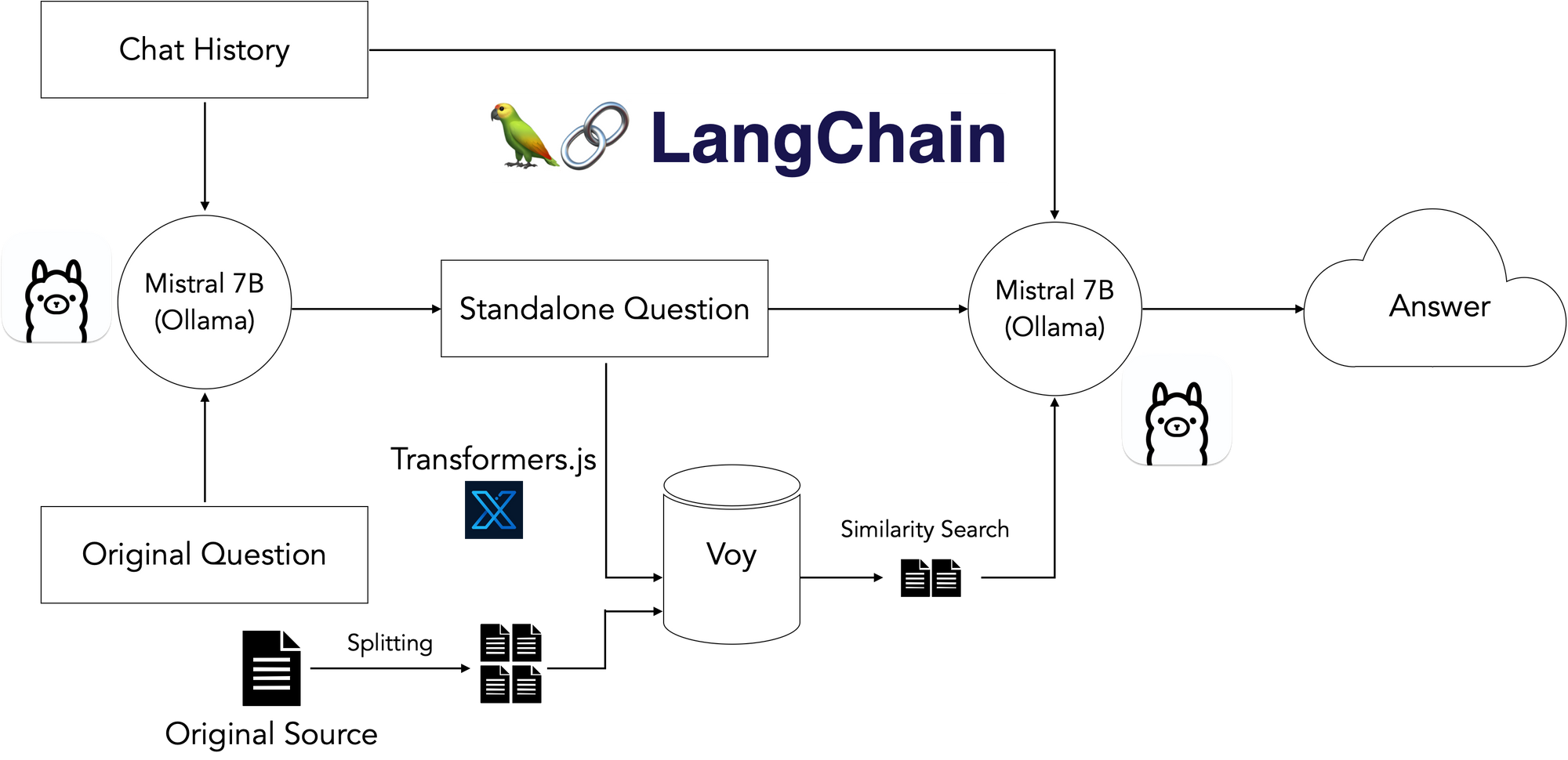LangChain took care of the document loading and splitting. For embeddings, I used a small HuggingFace embeddings model quantized to run in the browser using Xenova’s Transformers.js package, and for the vectorstore, I used a really neat Web Assembly vectorstore called Voy.
