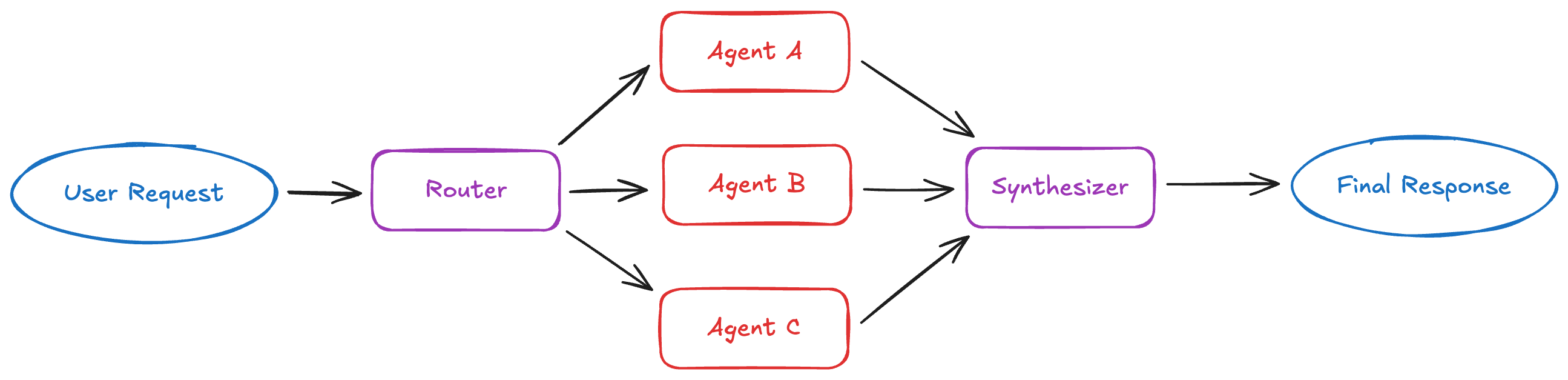 How it works: The router decomposes the query, invokes zero or more specialized agents in parallel, and synthesizes results into a coherent response. Routers are typically stateless, handling each request independently.