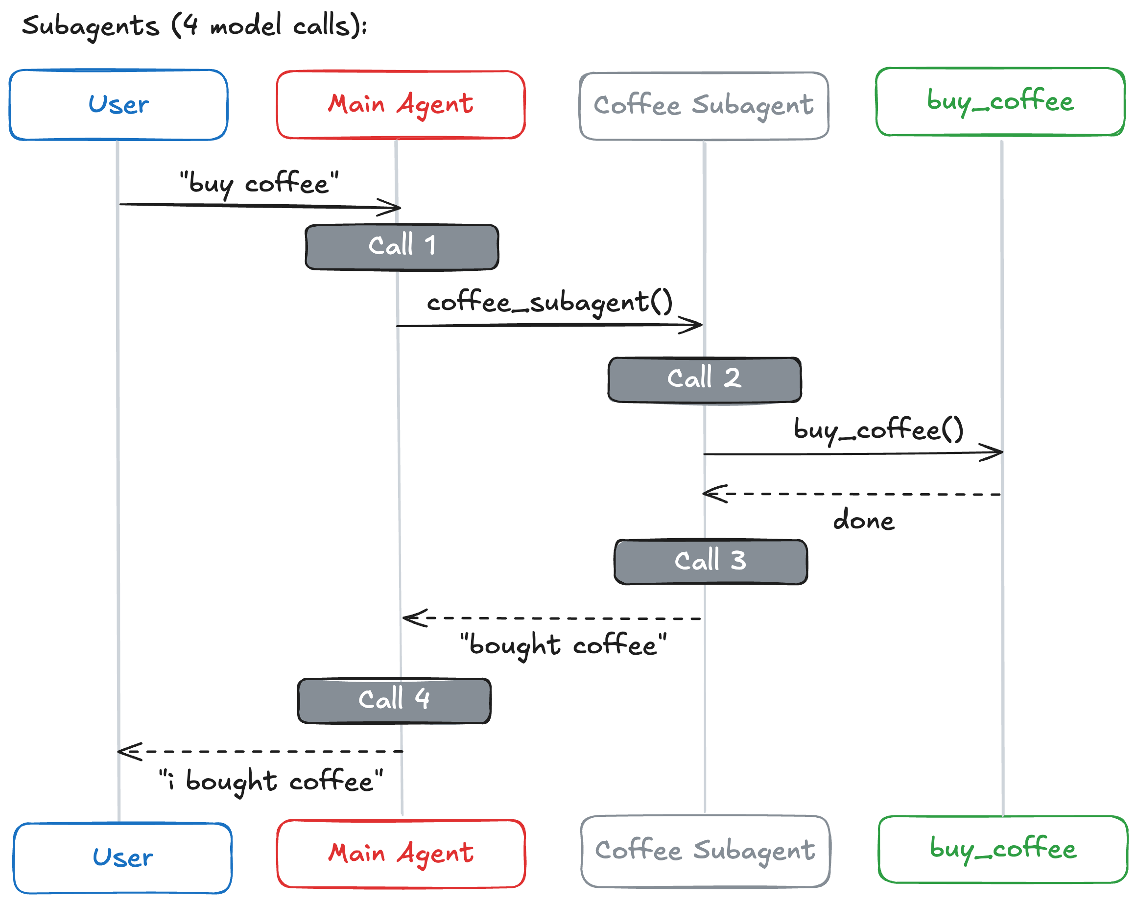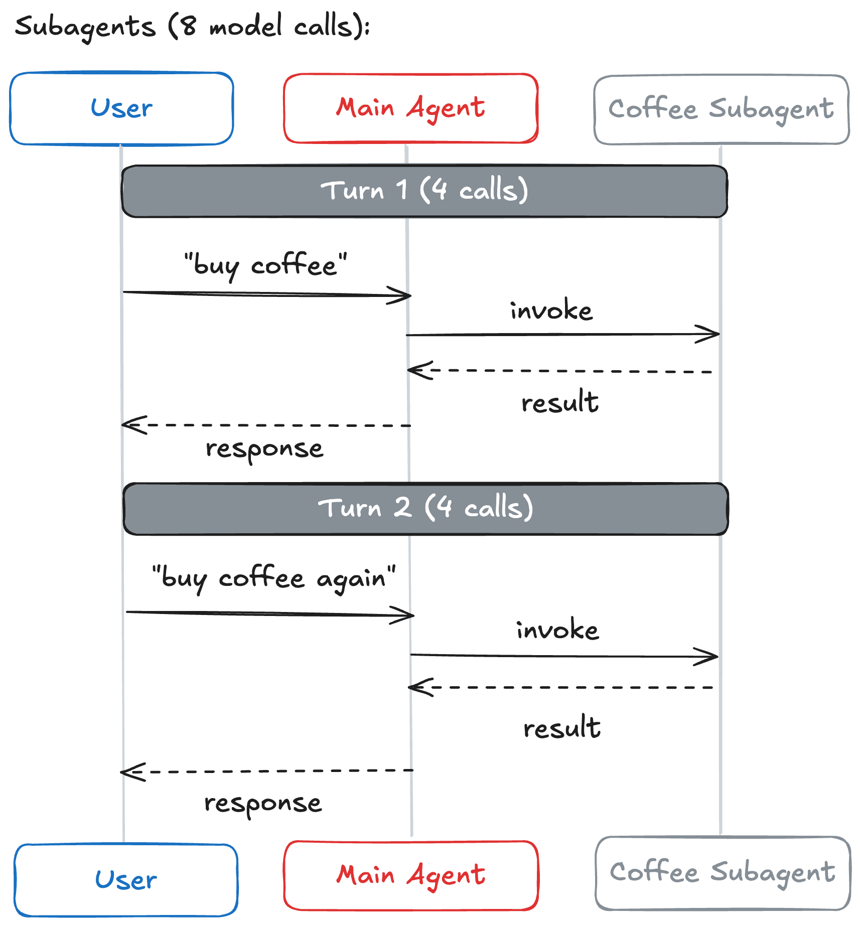 Key tradeoff: Adds one extra model call per interaction because results must flow back through the main agent. This overhead provides centralized control and context isolation, but costs latency and tokens.