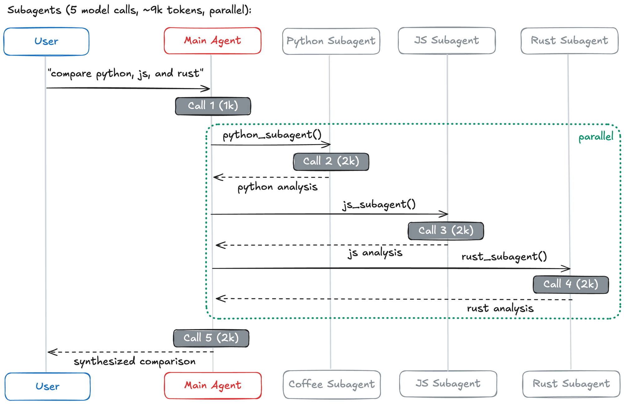 A user asks: “Compare Python, JavaScript, and Rust for web development.” Each language agent contains approximately 2000 tokens of documentation. All patterns can make parallel tool calls.