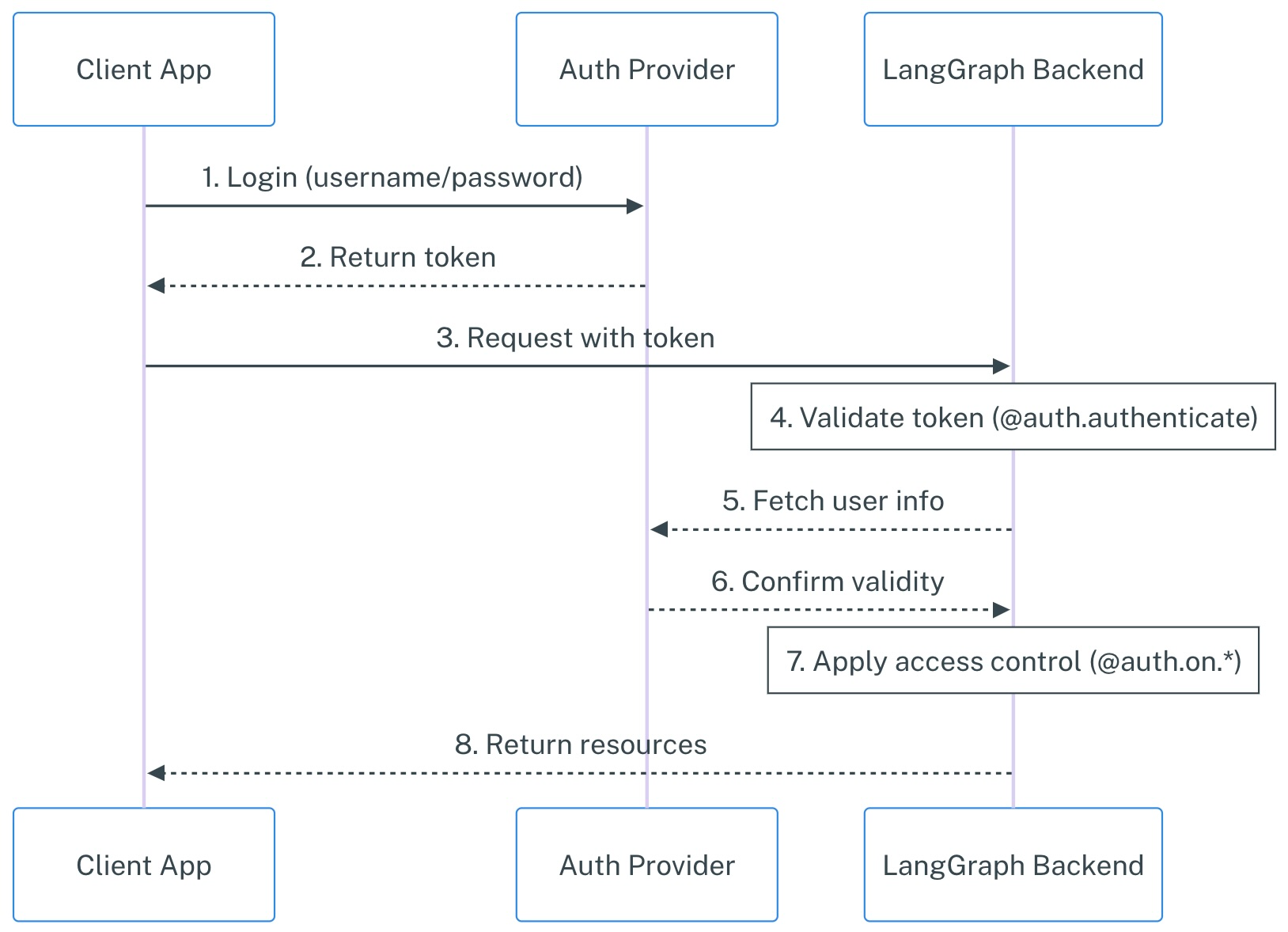 Custom authentication provides low-level primitives that integrate with any auth system while maintaining LangGraph's simplicity. A typical flow would look something like the following: