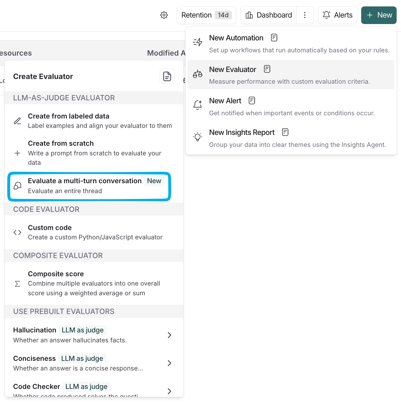 - Agent observability: Real-time, end-to-end quality monitoring on production traces, using Multi-Turn Evaluators.