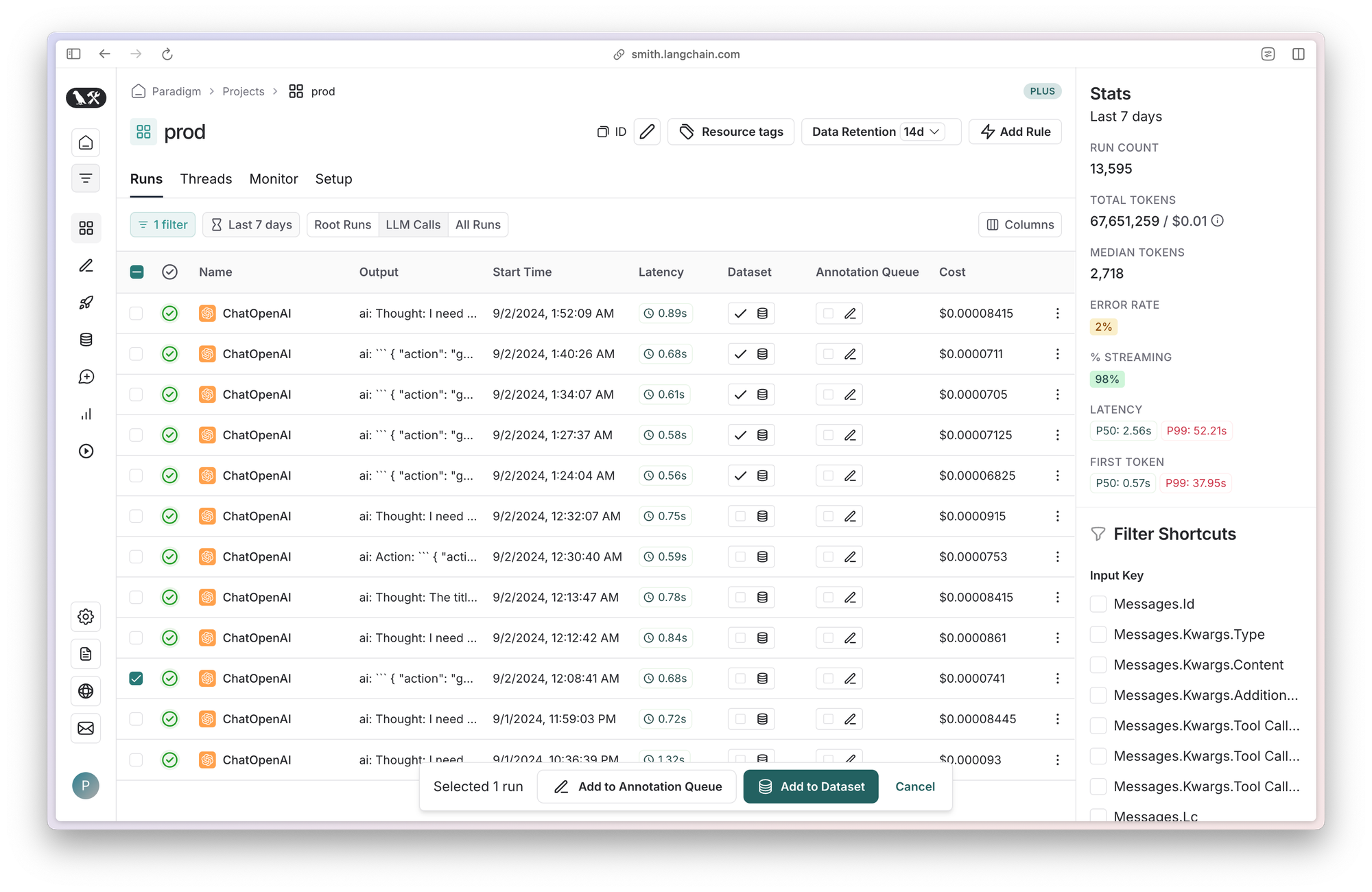 With LangSmith’s monitoring capabilities, Paradigm has also been able to execute and implement a precise usage-based pricing model. LangSmith gave the Paradigm team perfect context on their agent operations, including the specific tools leveraged, the order of their execution, and the token usage at each step. This allowed them to accurately calculate the cost of different tasks.