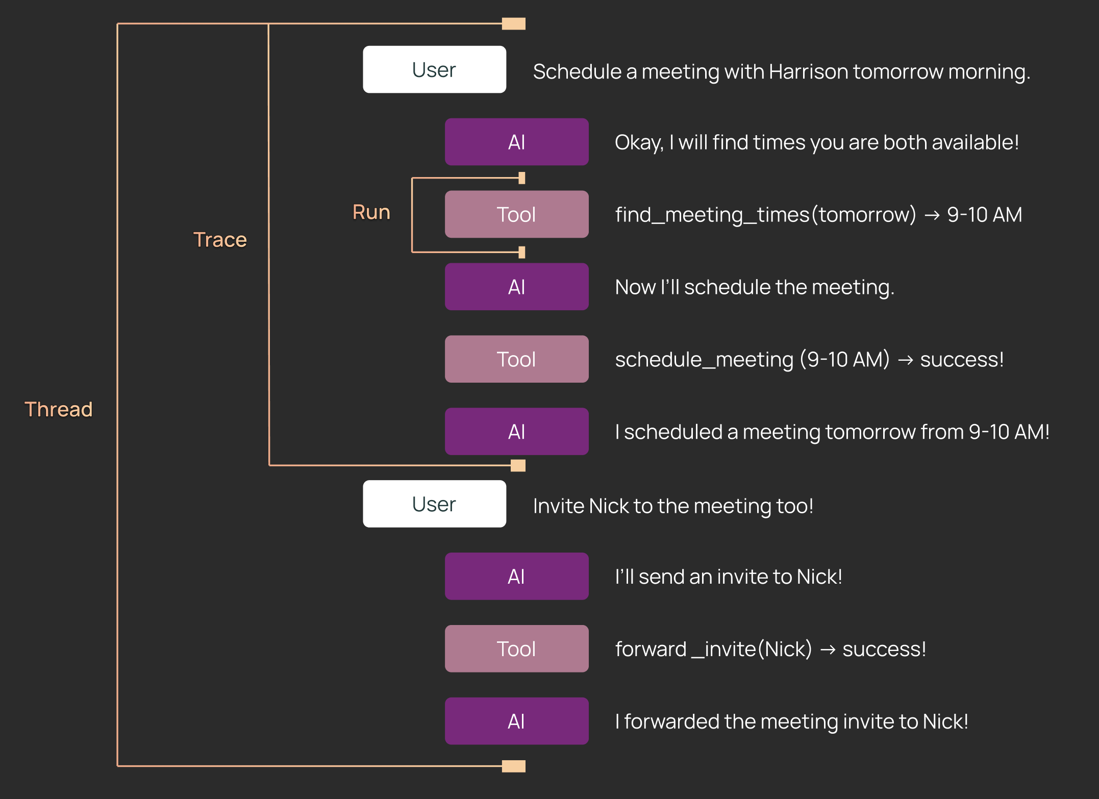 - Traces: A single execution of your agent. A trace is made up of a tree of Runs.