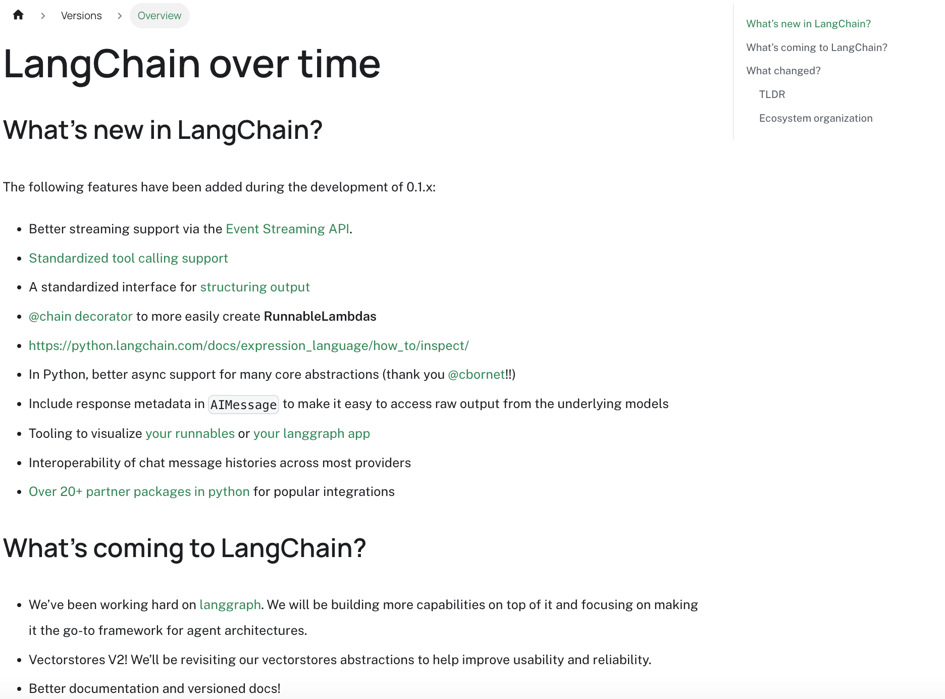 Our new “LangChain over time” section in the docs helps you stay on top of changes. There are guides on how LangChain has changed, how to upgrade, and how to map previous concepts from old versions to new ones. This has been a much-requested community feature - and we agree that it’s much needed!