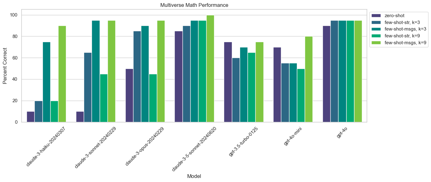 Unlike the few-shot dataset we created for the Multiverse Math task, this few-shot dataset was created entirely by hand. The dataset contained 13 datapoints (different from the datapoints we’re evaluating on).