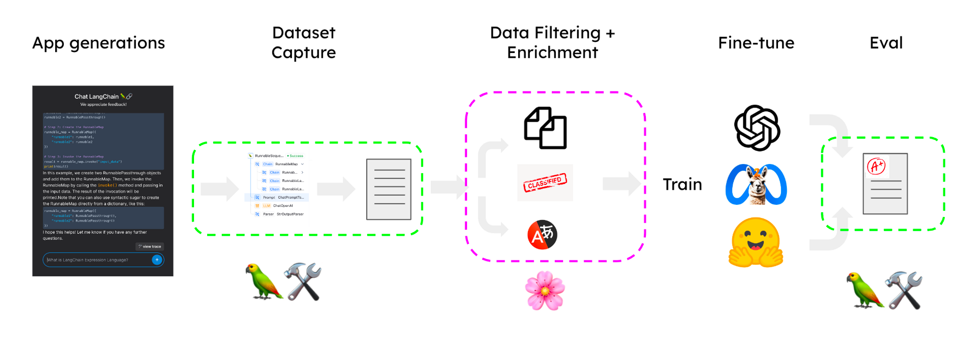 With the dataset in hand, it’s time to fine-tune! It’s easy to convert from LangChain’s message format to the formats expected by OpenAI, HuggingFace or other training frameworks. You can check out the linked notebook for more info!