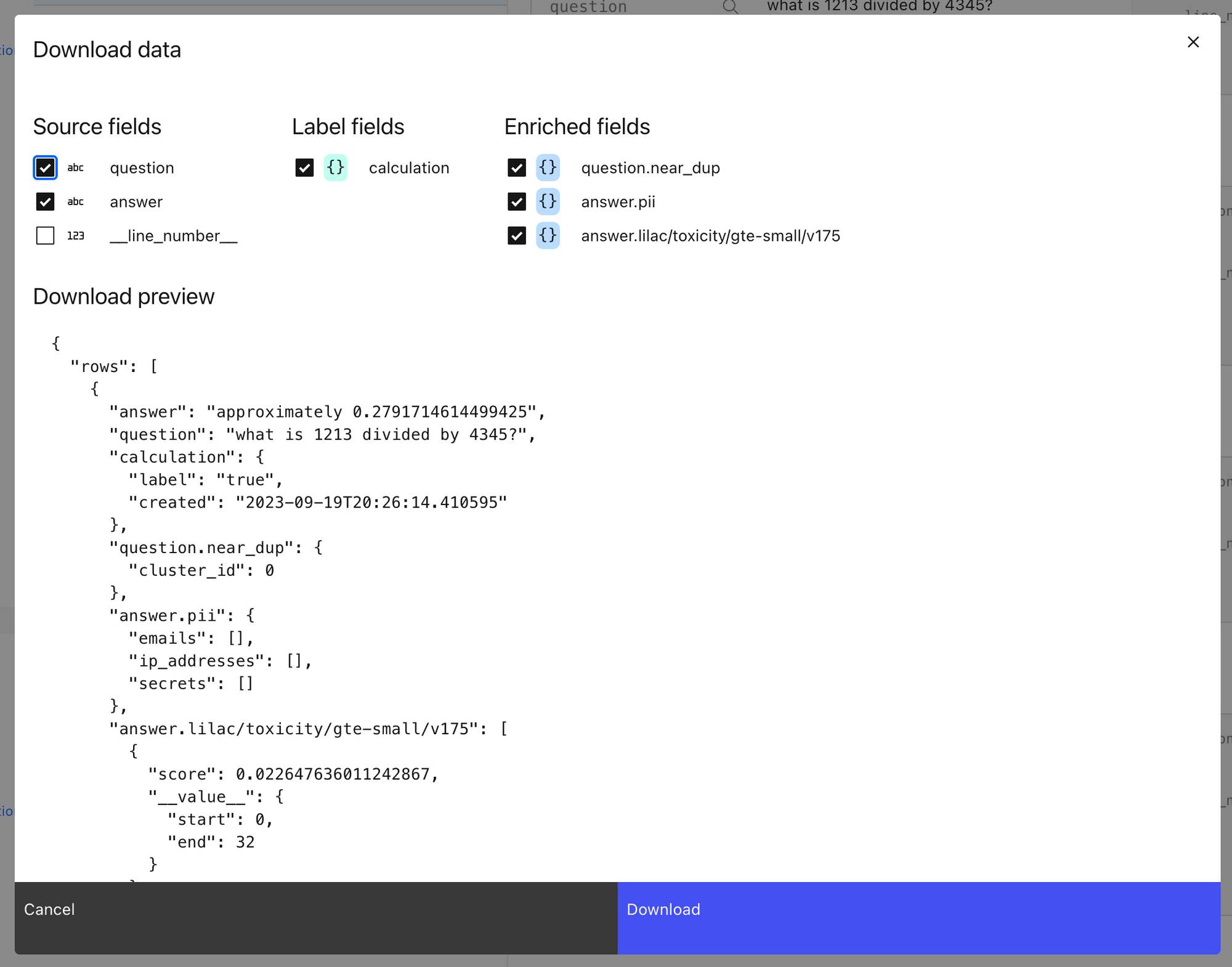 Once we’ve computed the information needed for filtering, you can export the enriched dataset via python, as shown in the notebook or via Lilac’s UI, which will create a browser download of a json file. We recommend the python API for downloading large amounts of data, or if you need a better control over the selection of data.