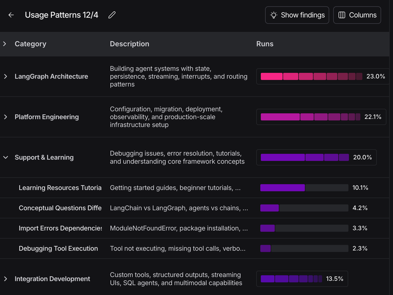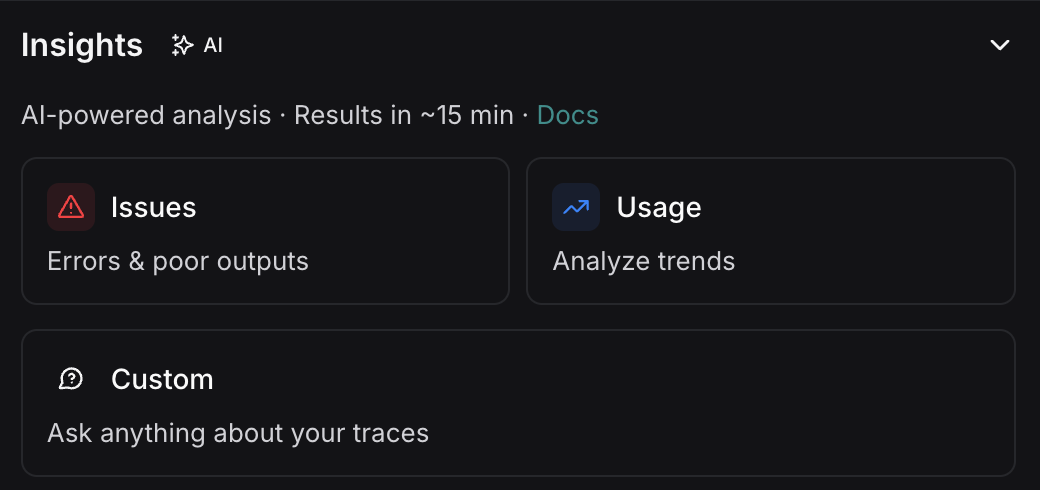 LangSmith Insights Agent uses clustering to automatically discover patterns in your traces. Instead of defining what to look for upfront, it analyzes thousands of conversations and surfaces the clusters that matter - usage patterns, error modes, or any dimension you specify. It handles the exploratory questions that would otherwise require manually reviewing hundreds of traces.