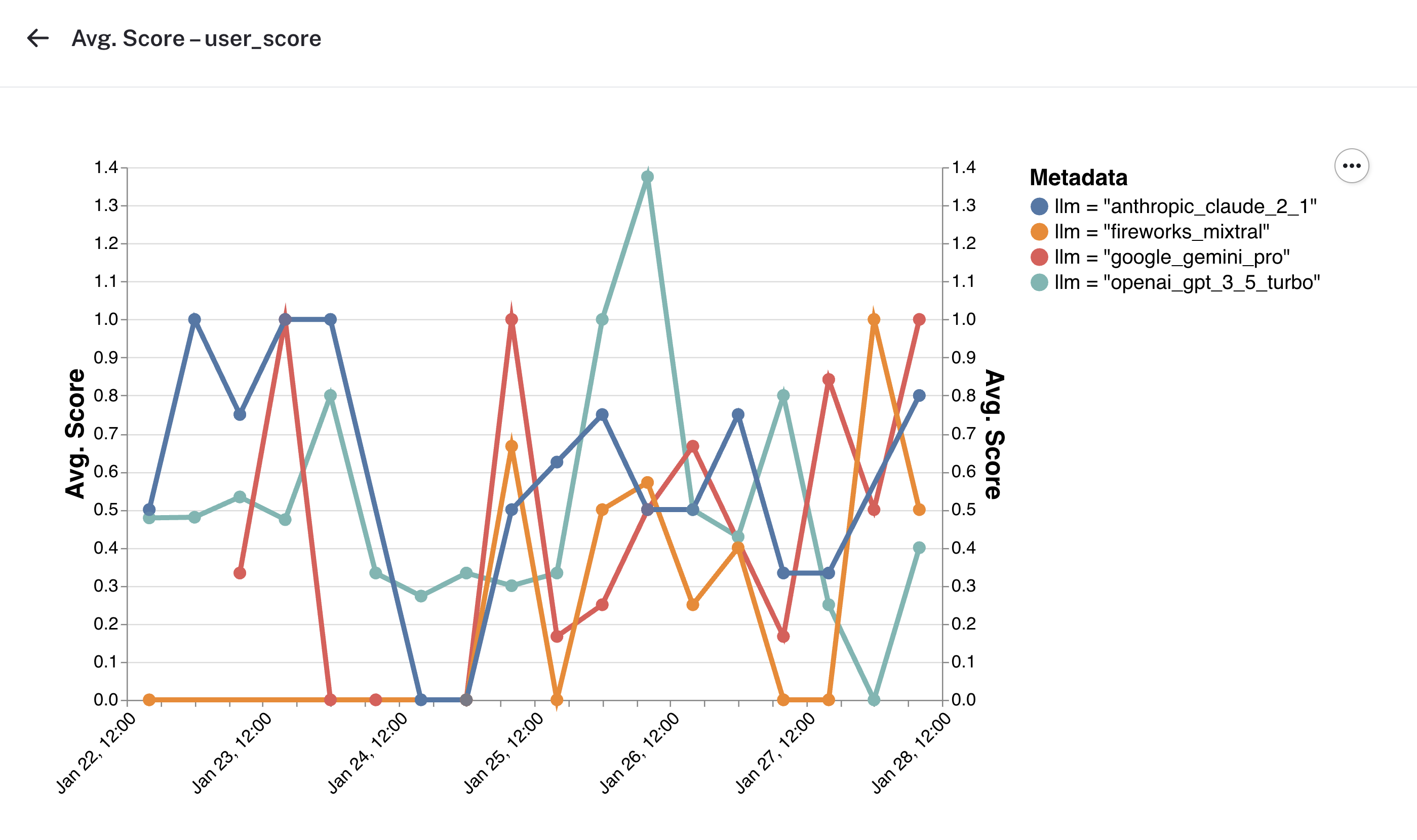 The monitoring section also shows you charts for feedback across different criteria over time. While our feedback data was noisy during this time period, you can imagine that seeing clear trends in user satisfaction in chatbot response across the different model providers would allow for assessing tradeoffs of model latency vs quality of response.
