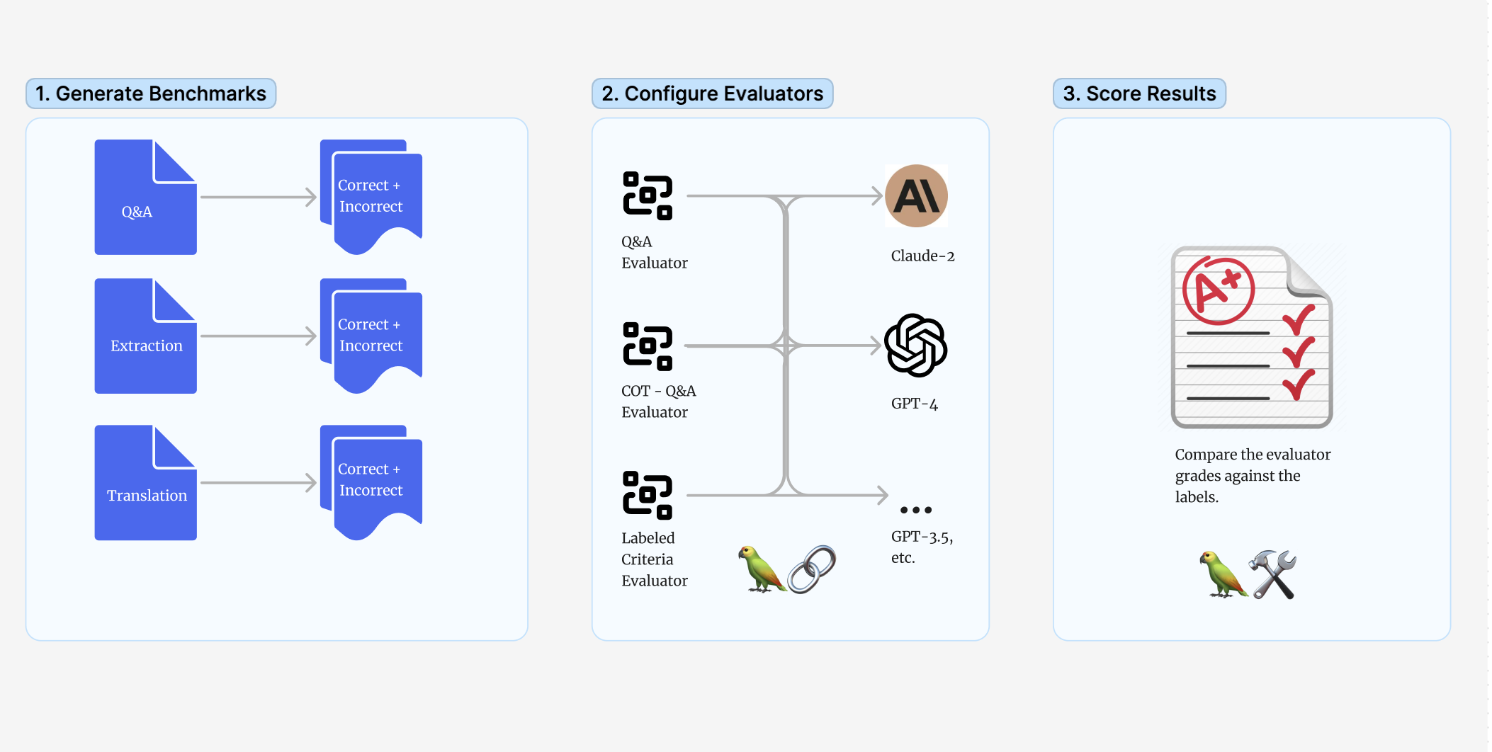 - QAEvalChain (link + prompt): prompts a model to grade the prediction as a teacher grading a quiz, ignoring spacing and wording.