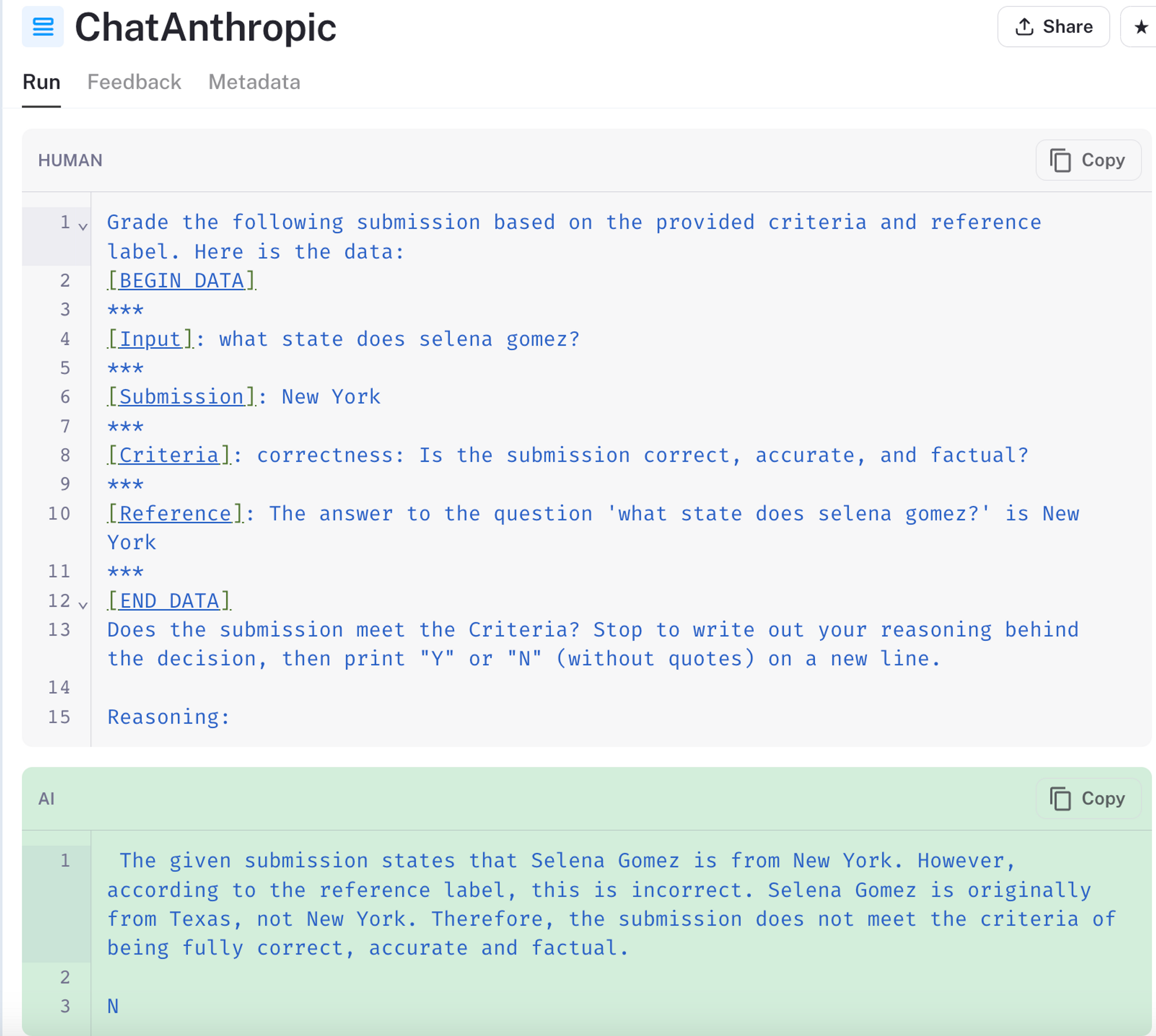 - LangChain also provides a “Criteria” evaluator (link), for testing whether a prediction meets the custom criterion provided (in this case, "correctness" relative to the reference). The prompt is similar to OpenAI's model graded evaluator prompt.