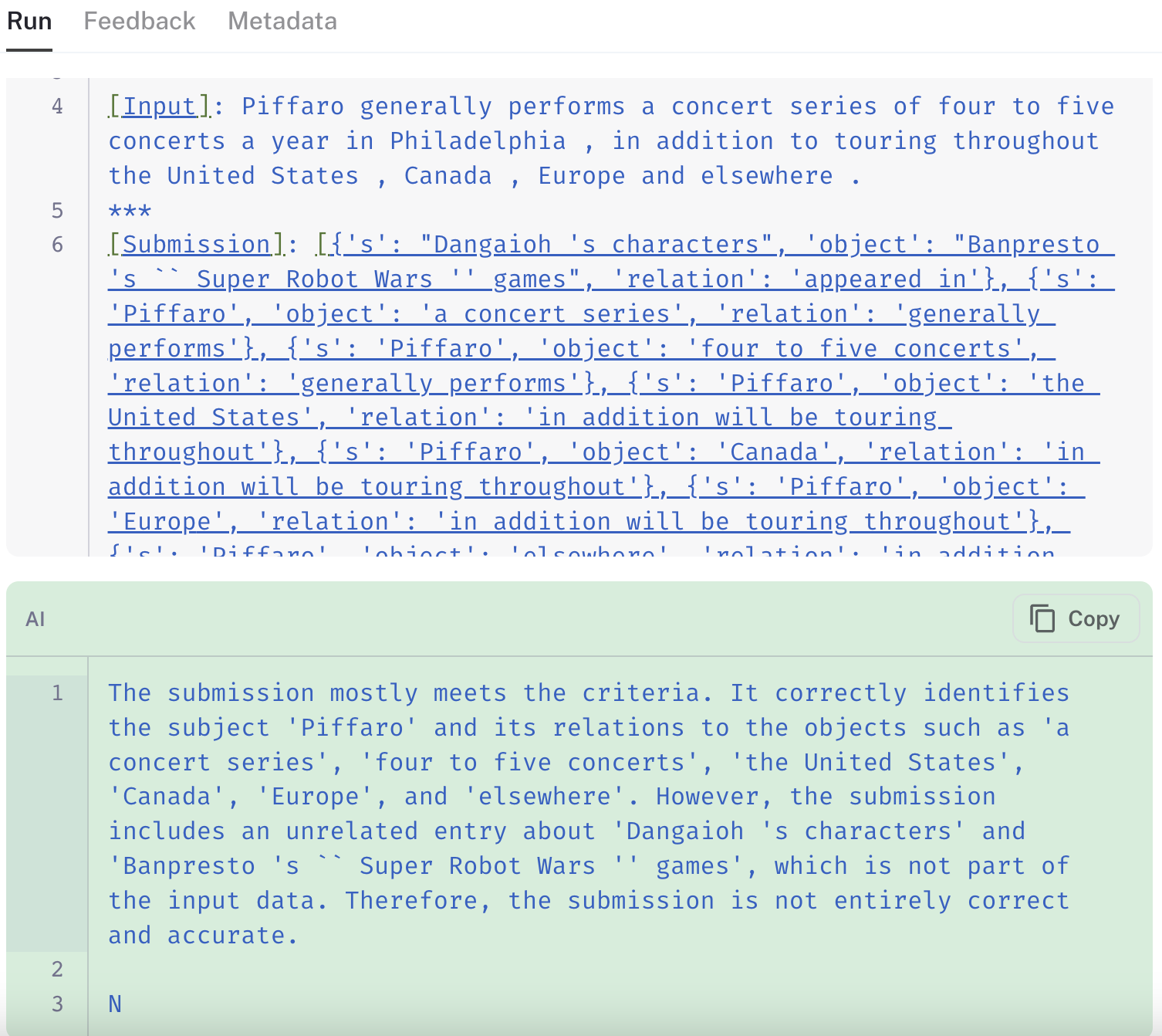 2. Zero-shot language models, like GPT-4 and Claude-2, carry inherent biases. These models can over-rely on their pre-trained knowledge, even when it conflicts with the actual data. For instance, when evaluating the example input "who is the CEO of Twitter" in the linked run,