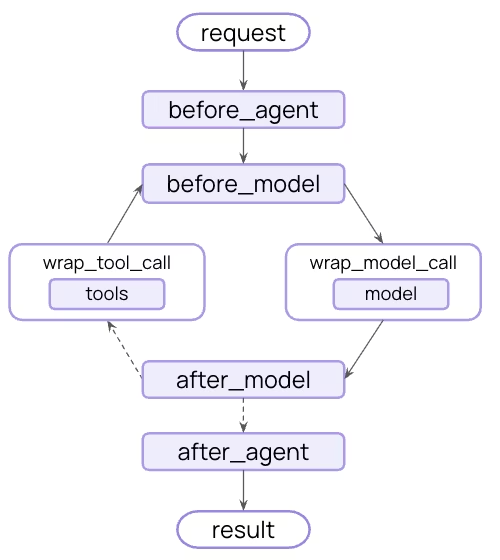 Middleware exposes a set of hooks that let you run custom logic before and after each step, so you can control what happens at every stage of the loop: