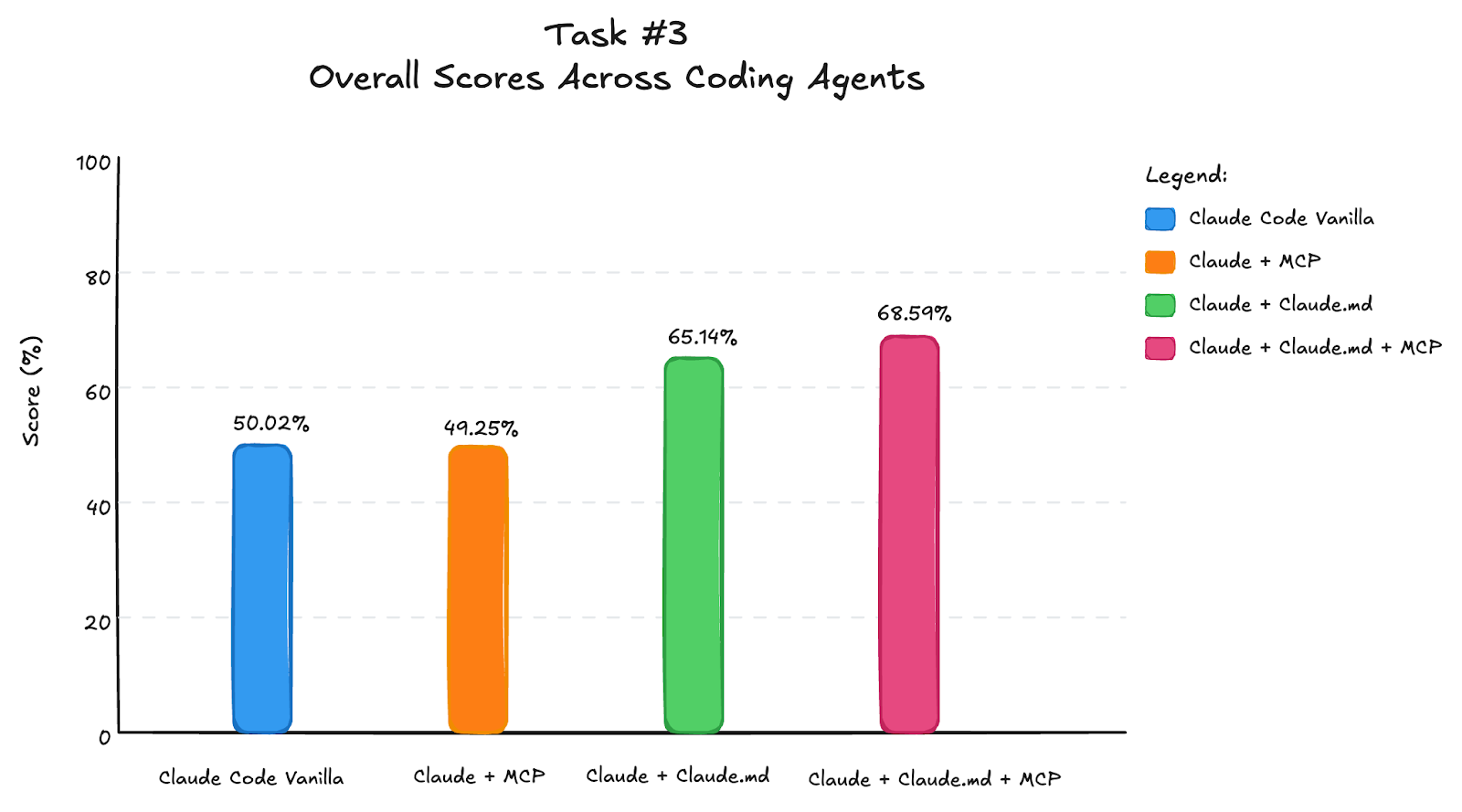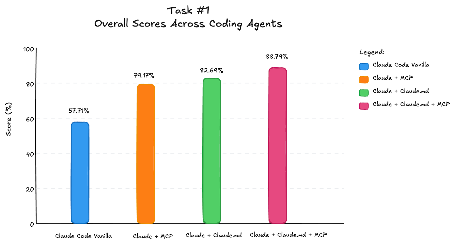 This doesn’t mean MCP tools didn’t help on their own. They improved scores by ~10 percentage points, mainly by grounding the agent in basic syntax and concepts. But for task completion and code quality, Claude.md was more important. The guide included pitfalls to avoid and principles to follow, which helped Claude Code think better and explore different parts of the library rather than stopping at high-level descriptions.