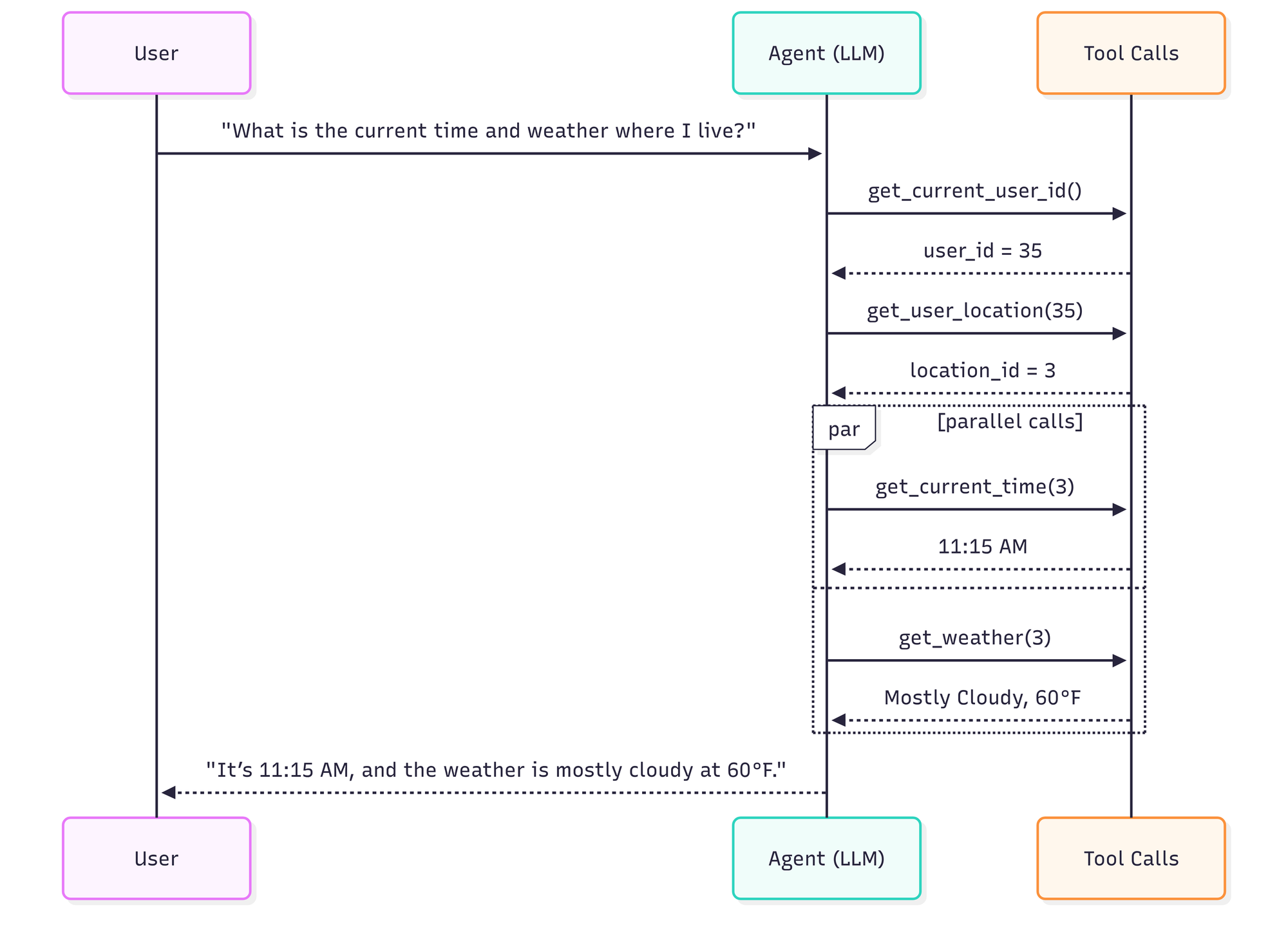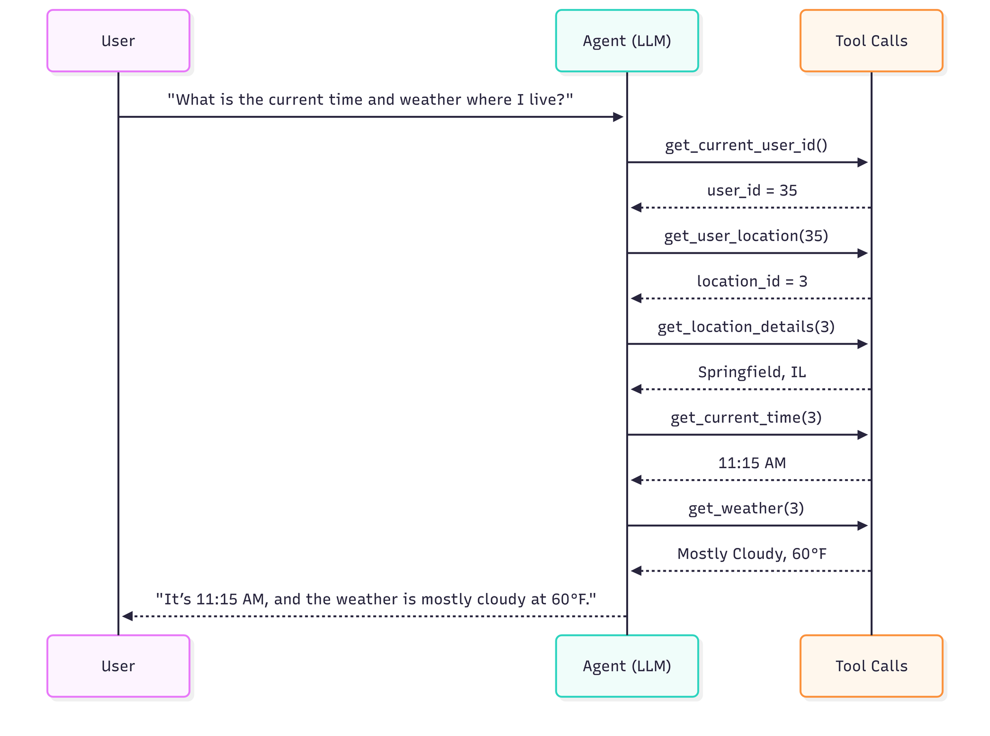 - It makes the fewest necessary tool calls (e.g., resolve user → resolve location → fetch time and weather)