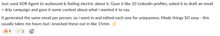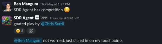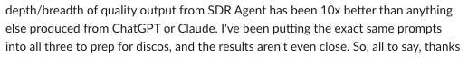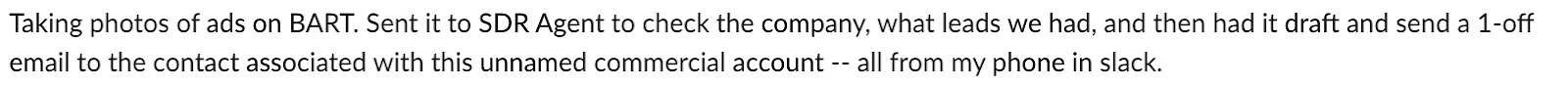We later built a conversational Slack interface as a side experiment, mostly to give SDRs a way to interact with the agent directly. What we didn't expect was how quickly it spread to the rest of the company. Because the agent was already connected to Salesforce, Gong, BigQuery, and Gmail, people found uses we hadn't designed for. Engineers checked product usage without writing SQL. Customer success pulled support history before renewal calls. Account executives summarized Gong transcripts before meetings.