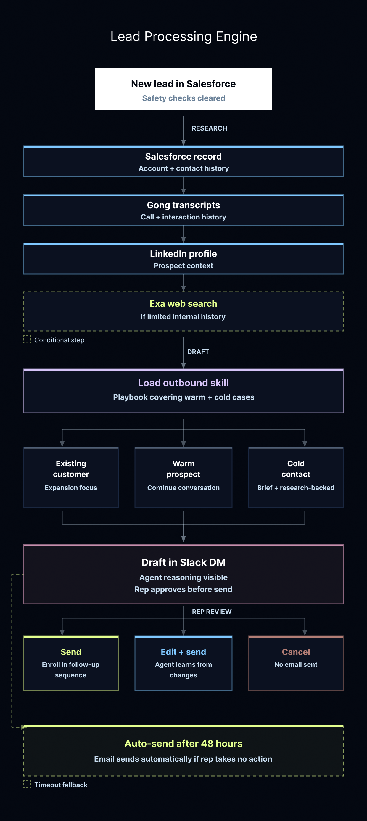We had two goals: reduce the time reps spend researching and drafting per lead, and improve conversion on marketing-generated inbound. Outbound research and drafting is systematic enough to automate, but only if the system is safe, auditable, and improves with use.