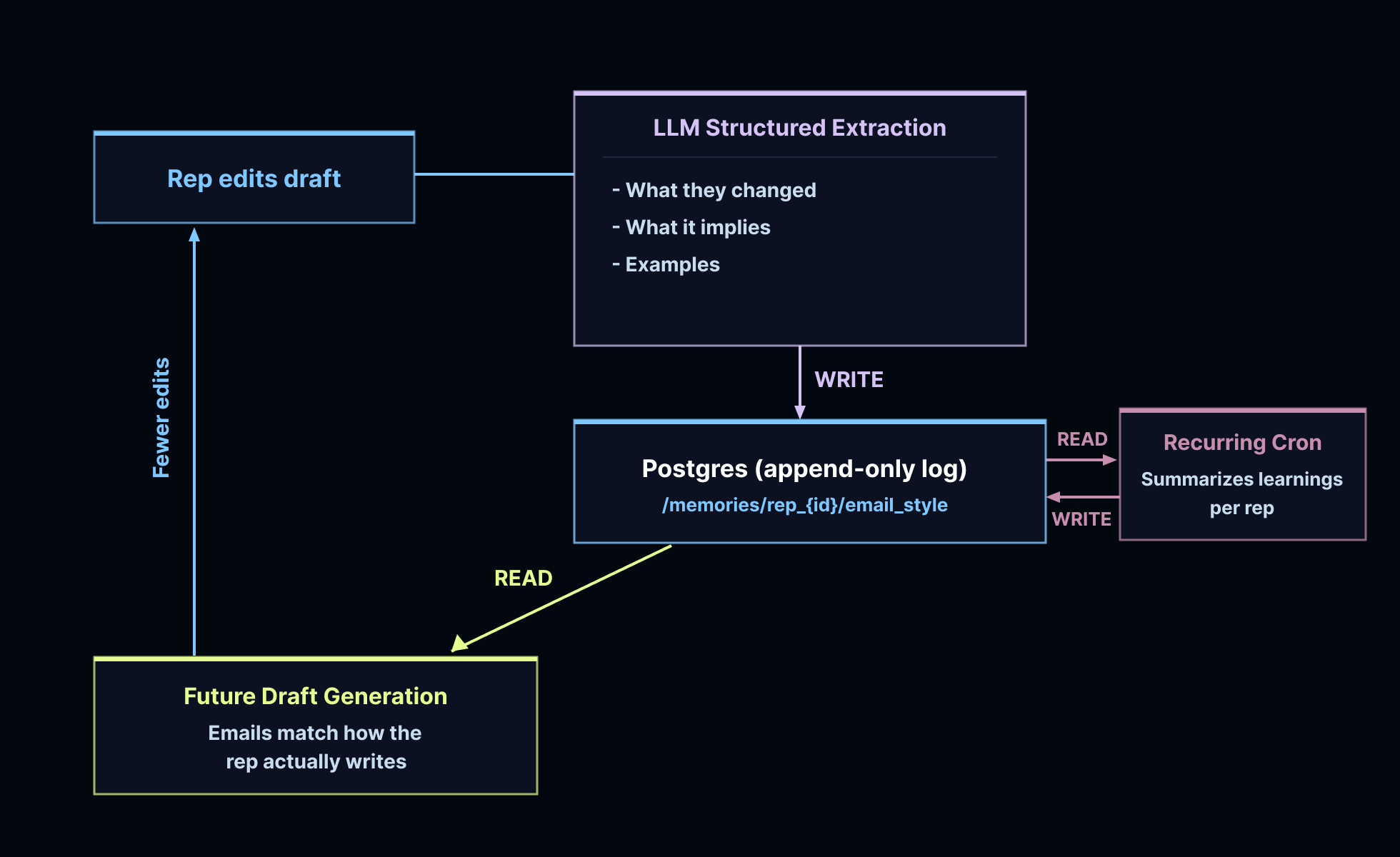 Each rep has stylistic preferences around tone and brevity. The feedback loop is automatic. Every edit teaches the agent, and the next draft reflects it. A weekly cron compacts these memories to keep them from getting bloated over time.