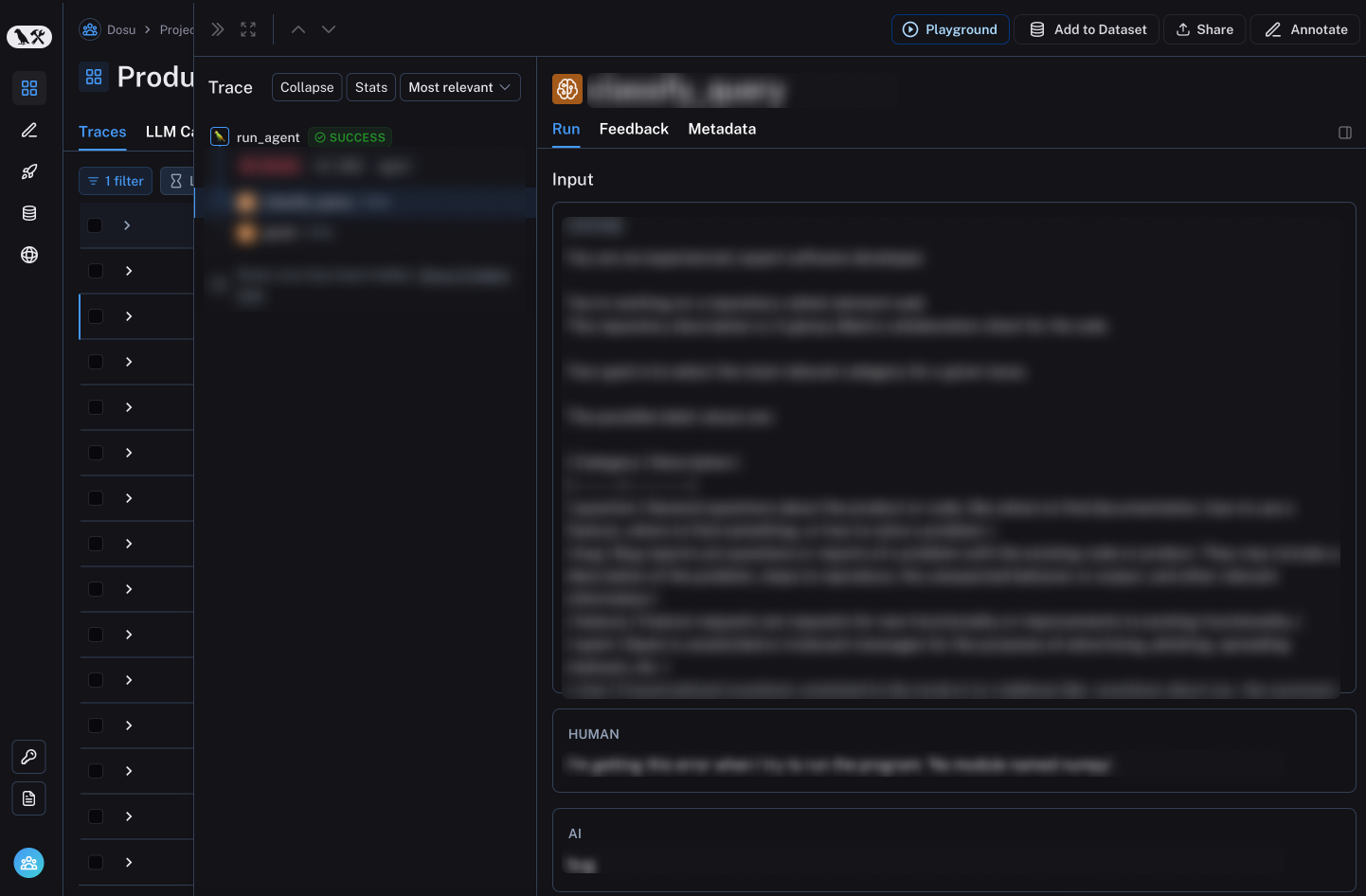 At Dosu, we are continuously iterating on our product. For every change we make, we need to understand it’s impact on end users. Evaluation driven development (EDD) allow us to ship with confidence. Over the last few months, LangSmith has allowed us to scale EDD by enabling us to easily monitor and search Dosu’s activity.