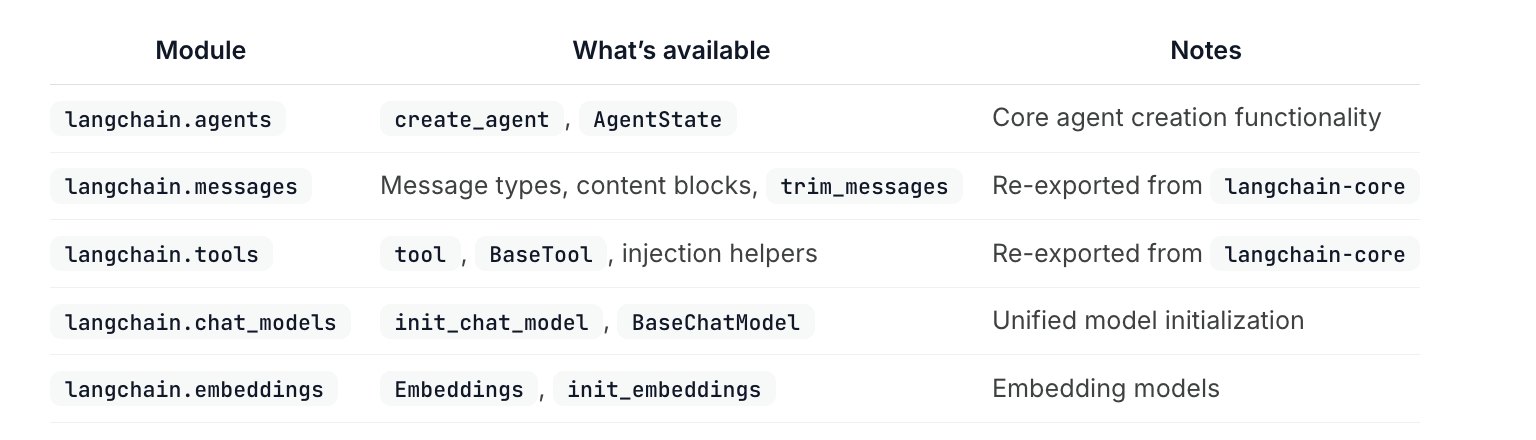 LangChain 1.0 reduces package scope to essential abstractions. Legacy functionality moves to langchain-classic for backwards compatibility. As the framework has matured, we've learned what patterns matter most. This streamlined package cuts through years of accumulated features to make LangChain simple and powerful.