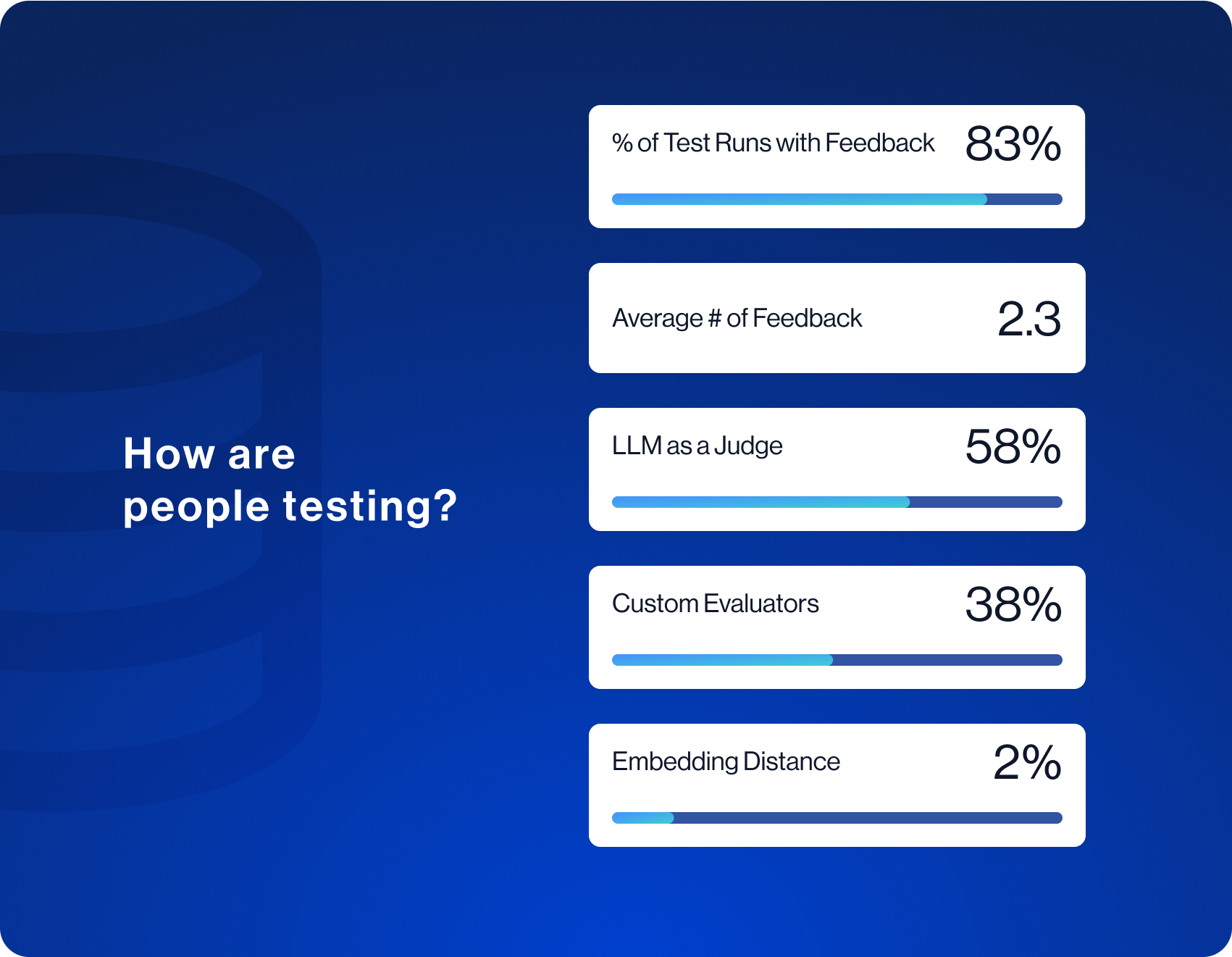 We see that most users are able to formulate some metrics to evaluate their LLM apps - 83% of test runs have some form of feedback associated with them. Of the runs with feedback, they average 2.3 different types of feedback, suggesting that developers are having difficulty finding a single metric to rely entirely on, and instead use multiple different metrics to evaluate.