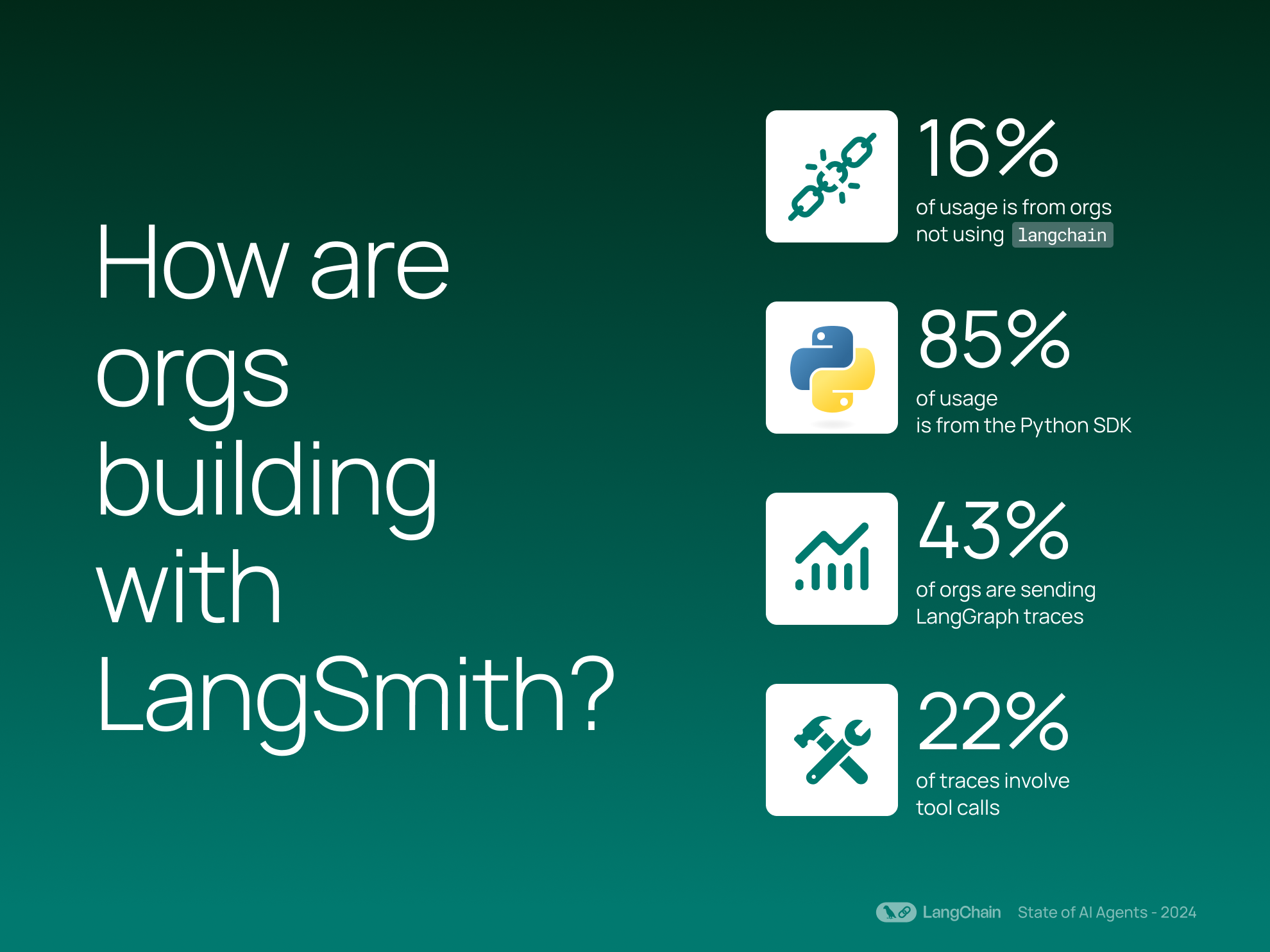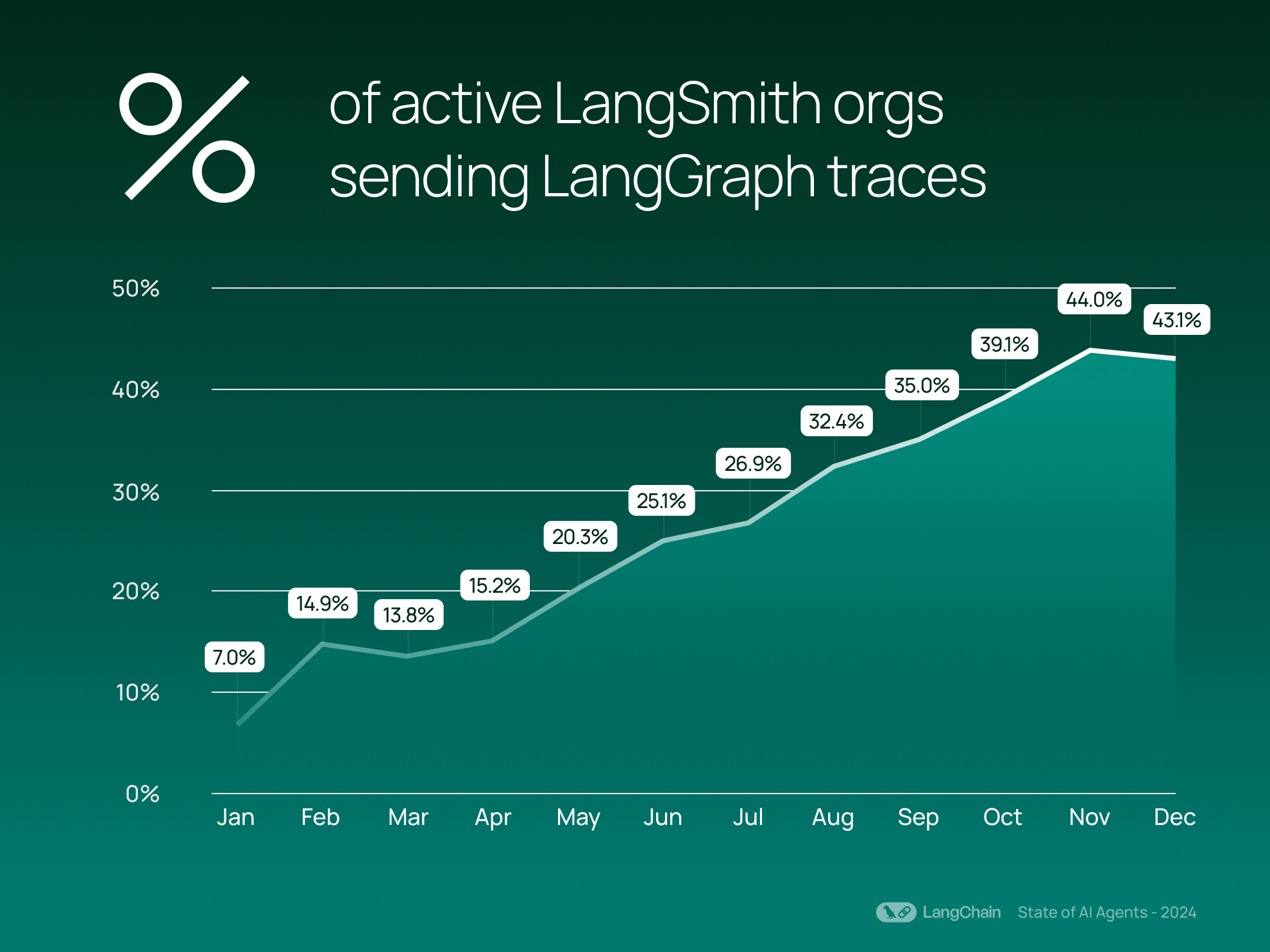 As companies are getting more serious about incorporating AI agents across various industries, adoption of our controllable agent framework, LangGraph, is also on the rise. Since its release in March 2024, LangGraph has steadily gained traction — with 43% of LangSmith organizations are now sending LangGraph traces. These traces represent complex, orchestrated tasks that go beyond basic LLM interactions.