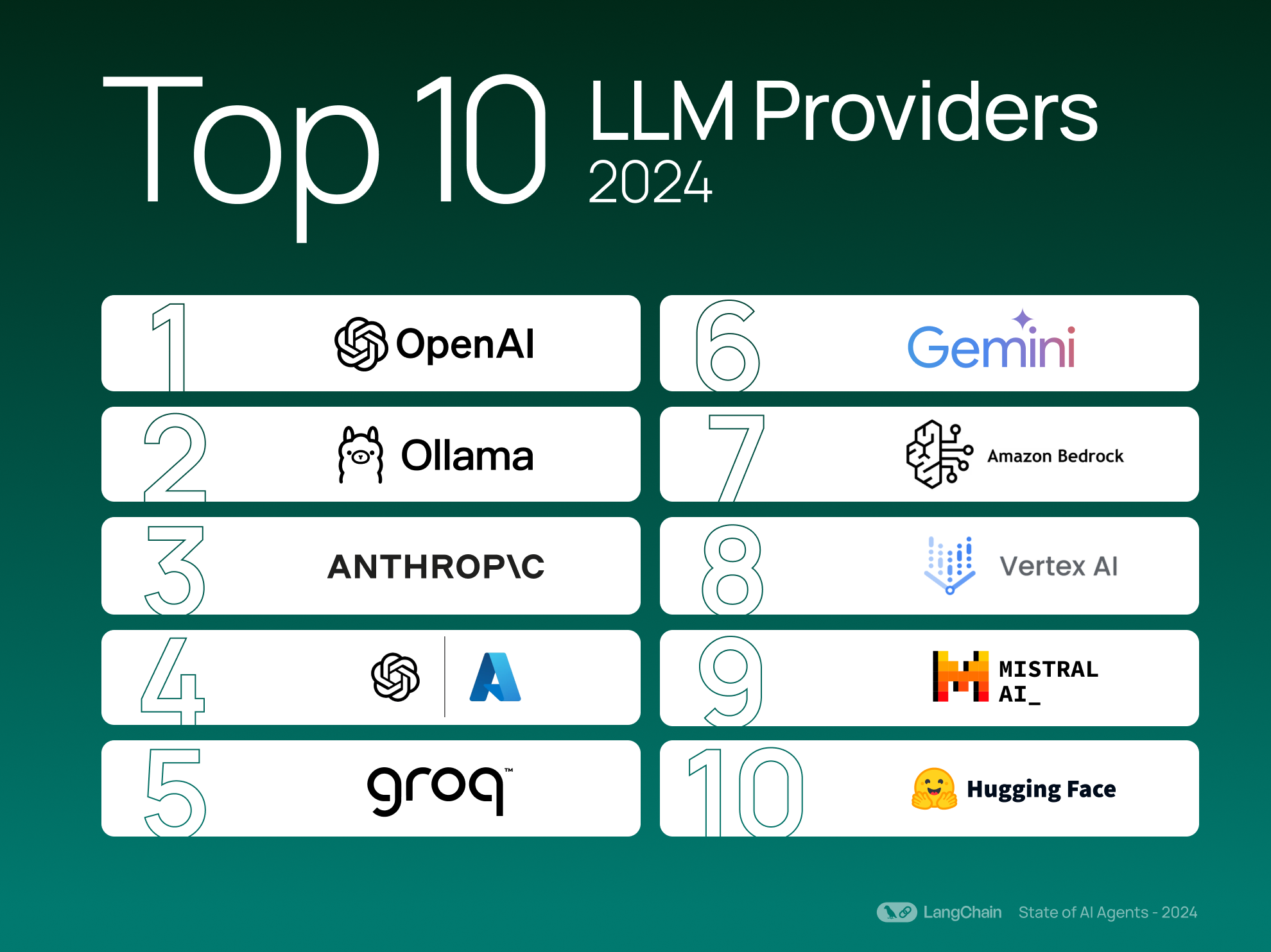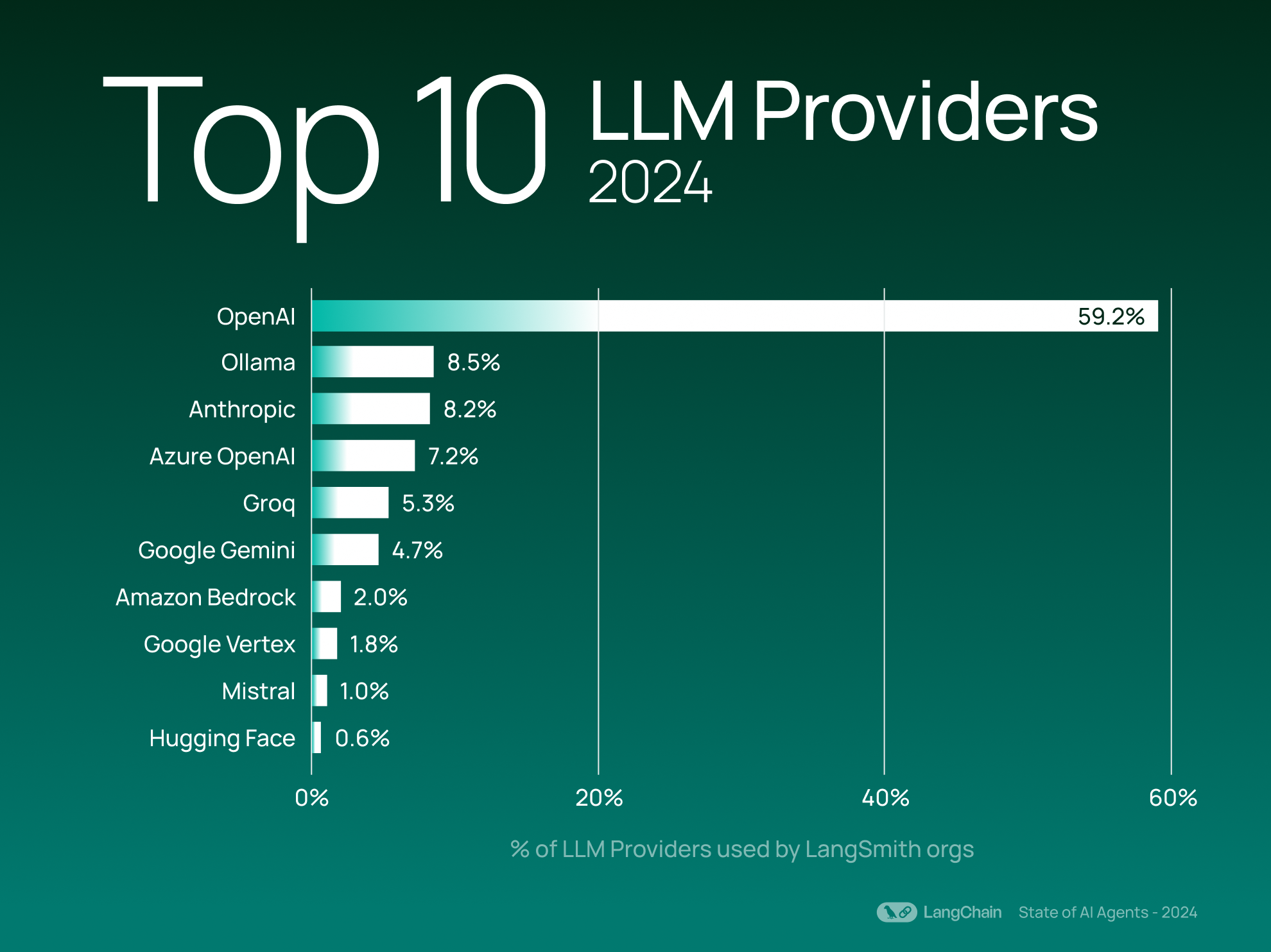 Like last year’s results, OpenAI reigns as the most used LLM provider among LangSmith users — used more than 6x as much as Ollama, the next-most popular provider (counted by LangSmith organization usage).