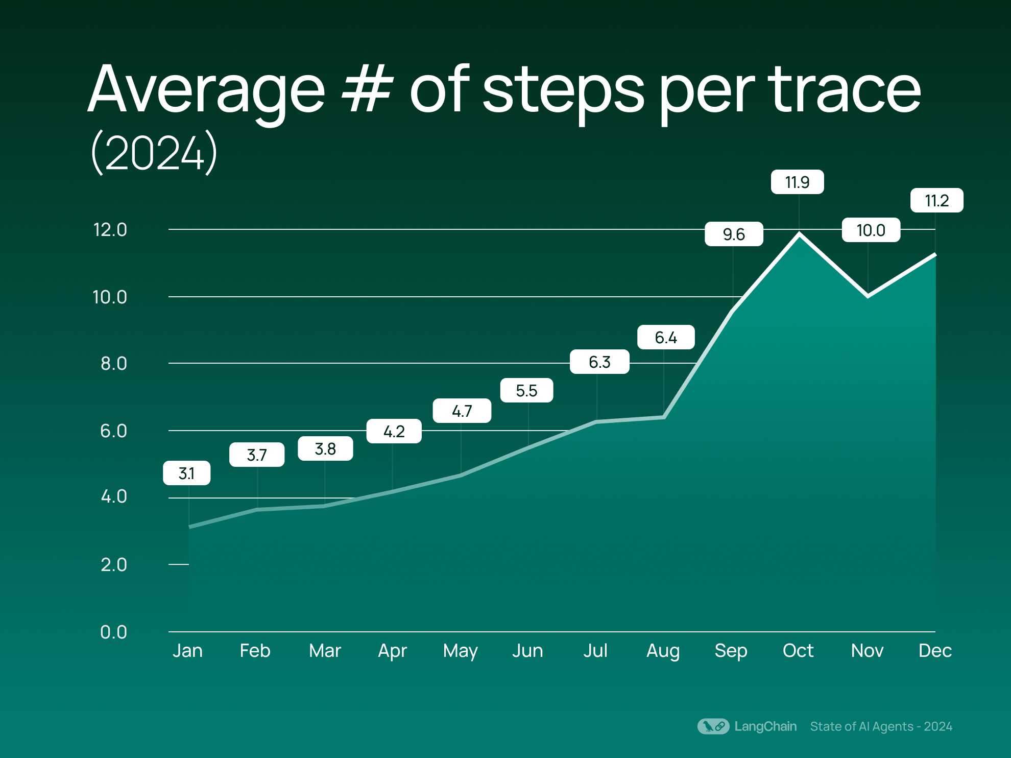 The average number of steps per trace has more than doubled over the past year, rising from on average 2.8 steps (2023) to 7.7 steps (2024). We define a step as a distinct operation within a trace, such as a call to an LLM, retriever, or tool. This growth in steps signals that organizations are leveraging more complex and multi-faceted workflows. Rather than a simple question-answer interaction, users are building systems that chain together multiple tasks, such as retrieving information, processing it, and generating actionable results.