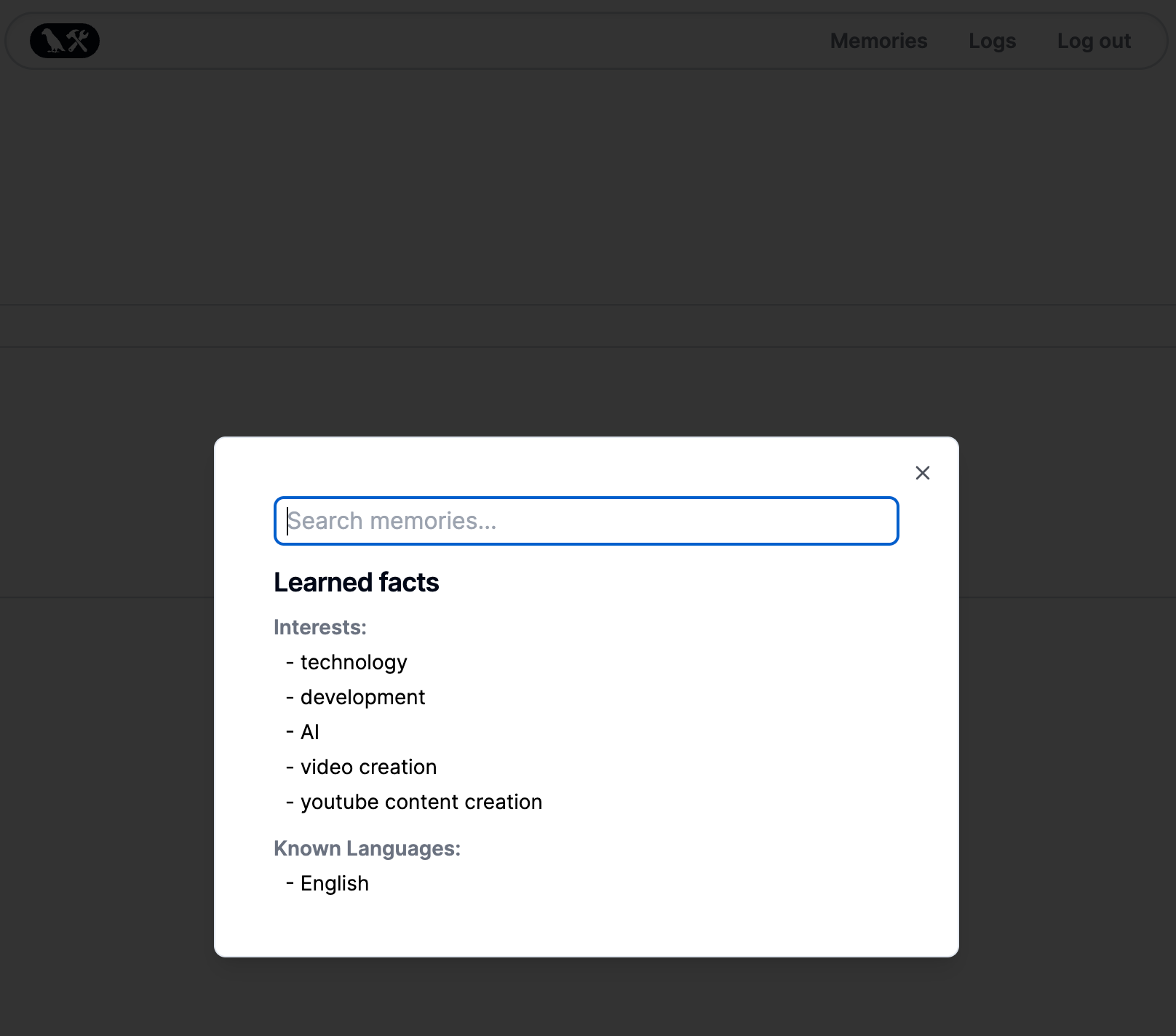 Start typing in the "Search memories..." input, and in real time you'll see the wide variety of facts LangFriend is storing about you: