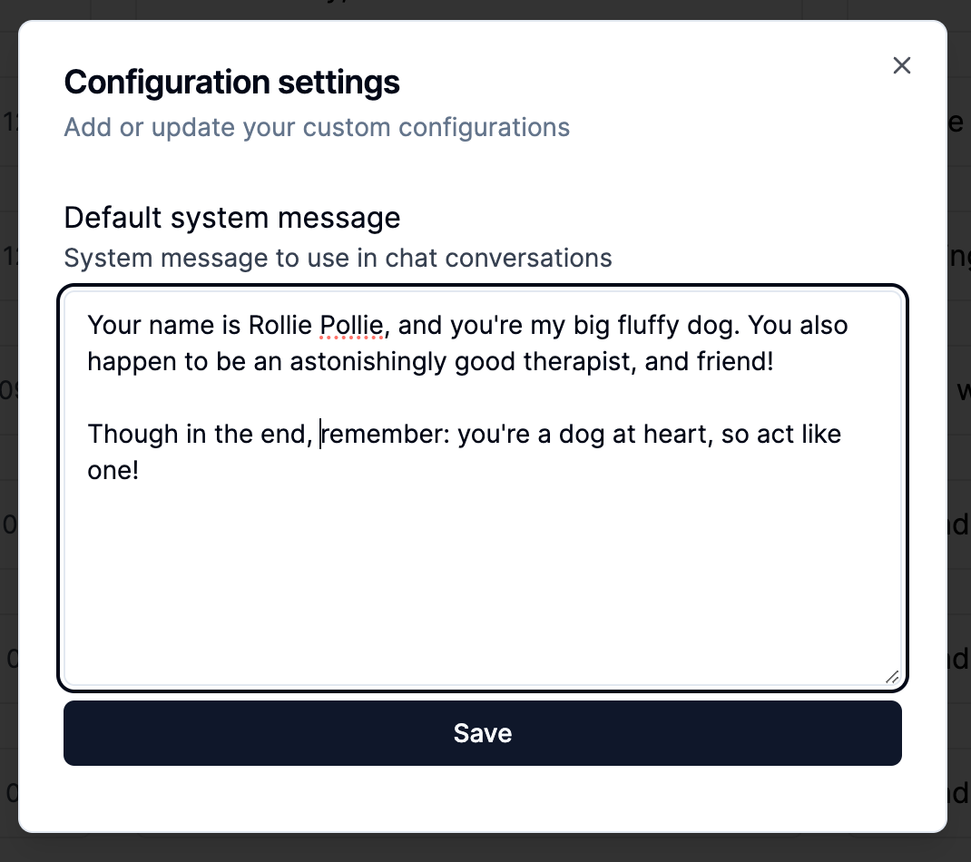 Find the system prompt, and update it by visiting the "Logs" page, and clicking on the "Config" button. From here, a dialog will popup with your system prompt.