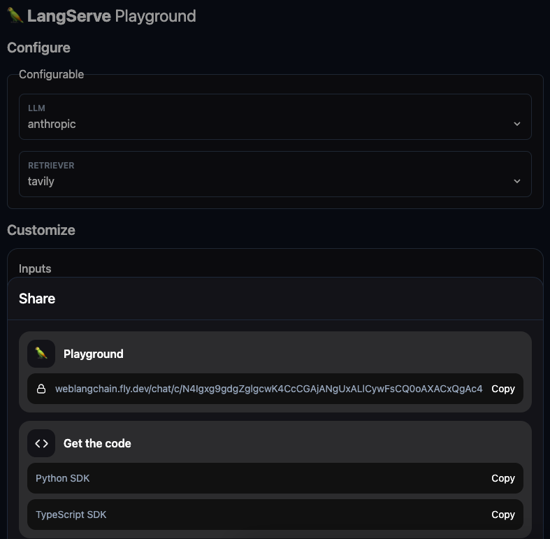With configuration, you can save different versions of configurations via a URL. This can be used in a few ways. With WebLangChain, we expose this to the end user so that they can use that configuration in the UI. We imagine this more being used for internal apps, where you want to let internal users choose between different configuration options. We also expose this functionality in the playground, as seen below where you can copy a URL for a given configuration.