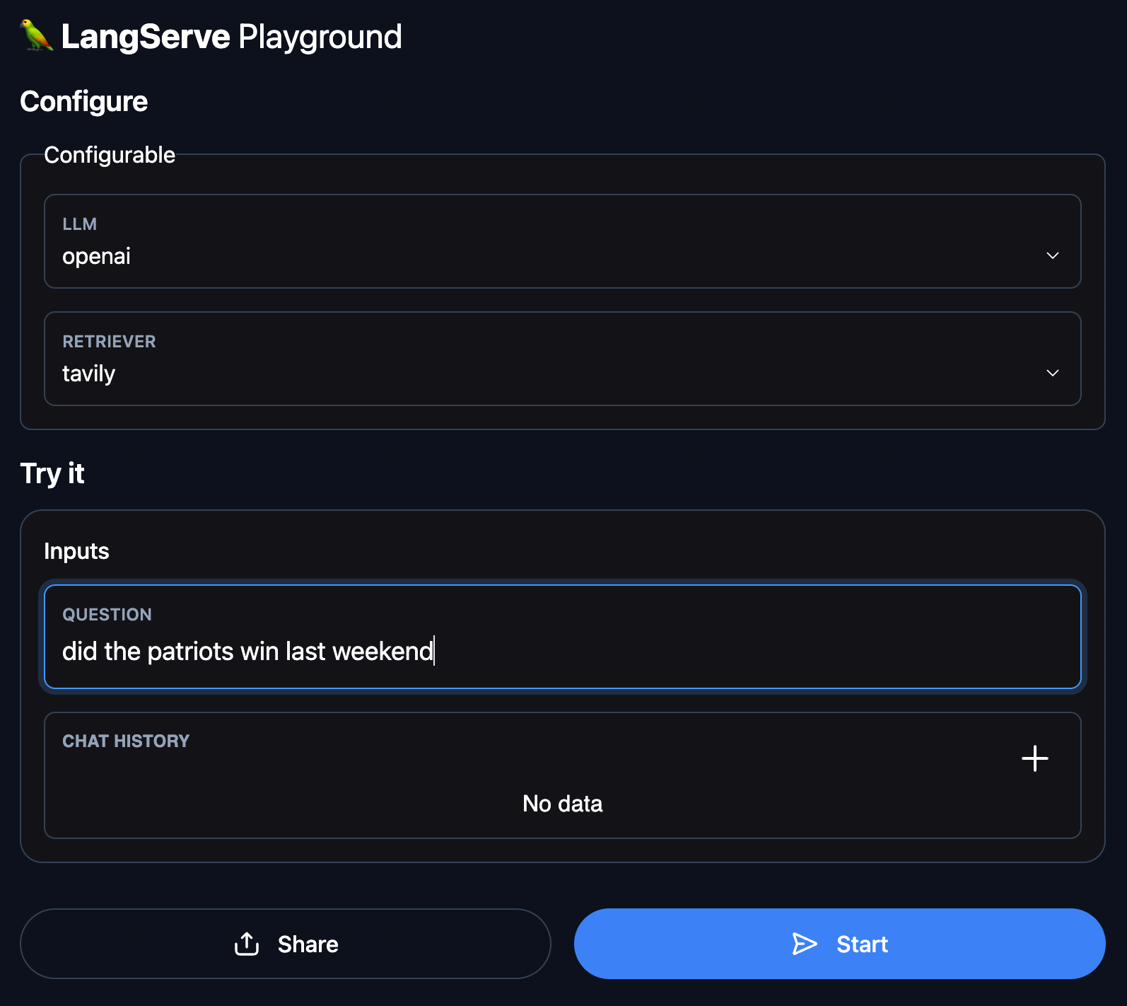 Now when you use LangServe to deploy your chain you get for free a playground experience. In this playground you can change the values of certain, configurable parameters (more on that later) as well as try out different inputs and get the response streamed back in real time.