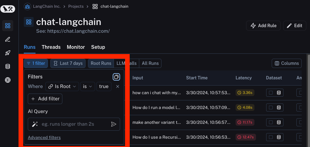 AI Query: Don't know how to construct your trace in the UI? Type in what you want to search for in natural language and we will use an LLM to convert it to our filtering language! (Yes, we monitor this with LangSmith)