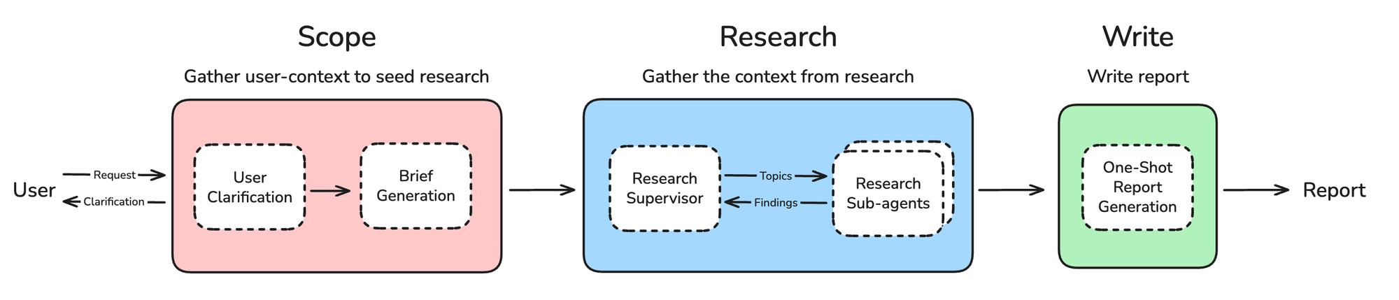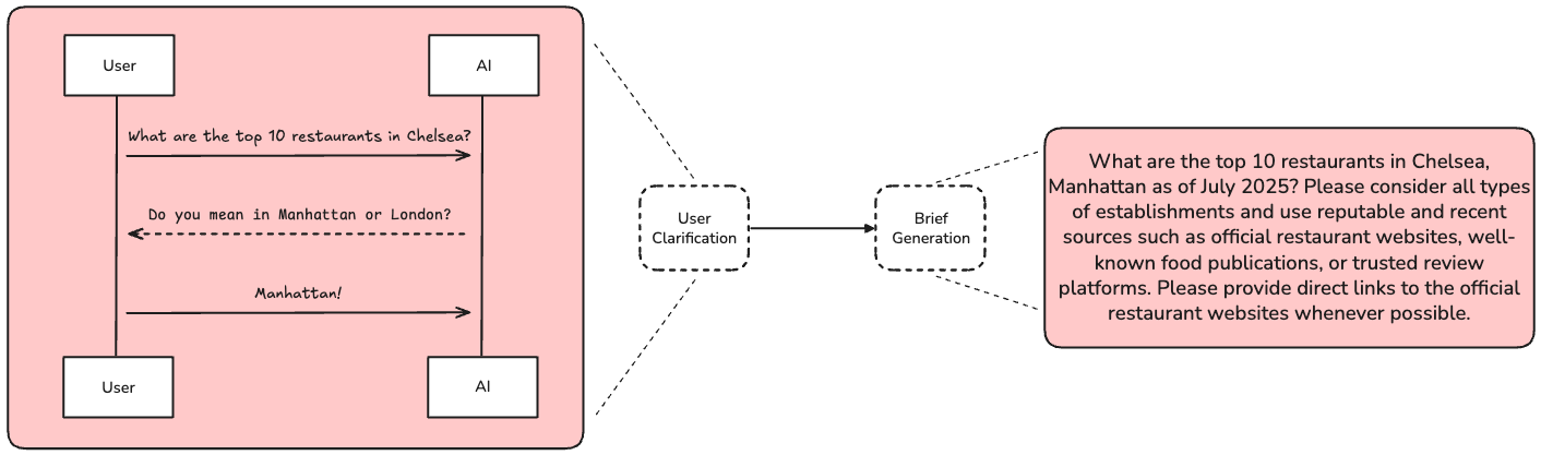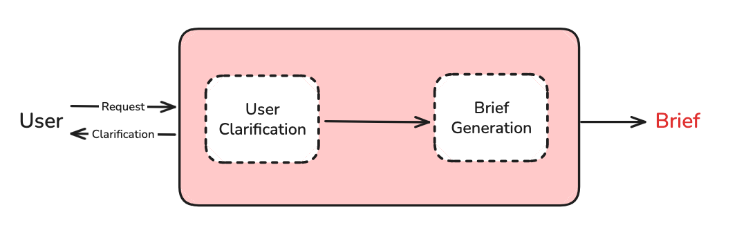 The chat interaction can include clarification questions, follow-ups, or user-provided examples (e.g., a prior deep research report). Because the interaction can be quite verbose and token-heavy, we translate it into a comprehensive, yet focused research brief. The research brief serves as our north star for success, and we refer back to it throughout the research and writing phases.